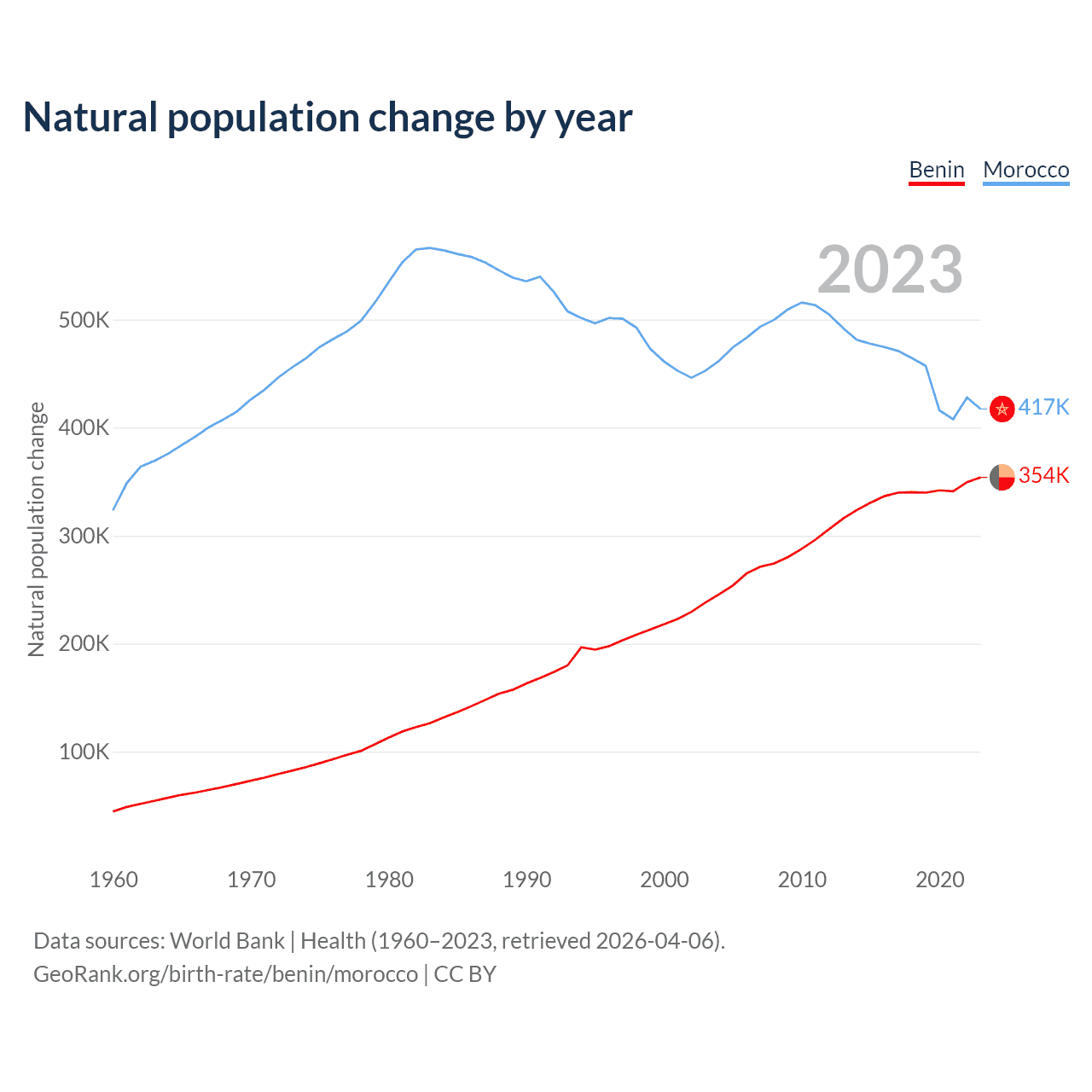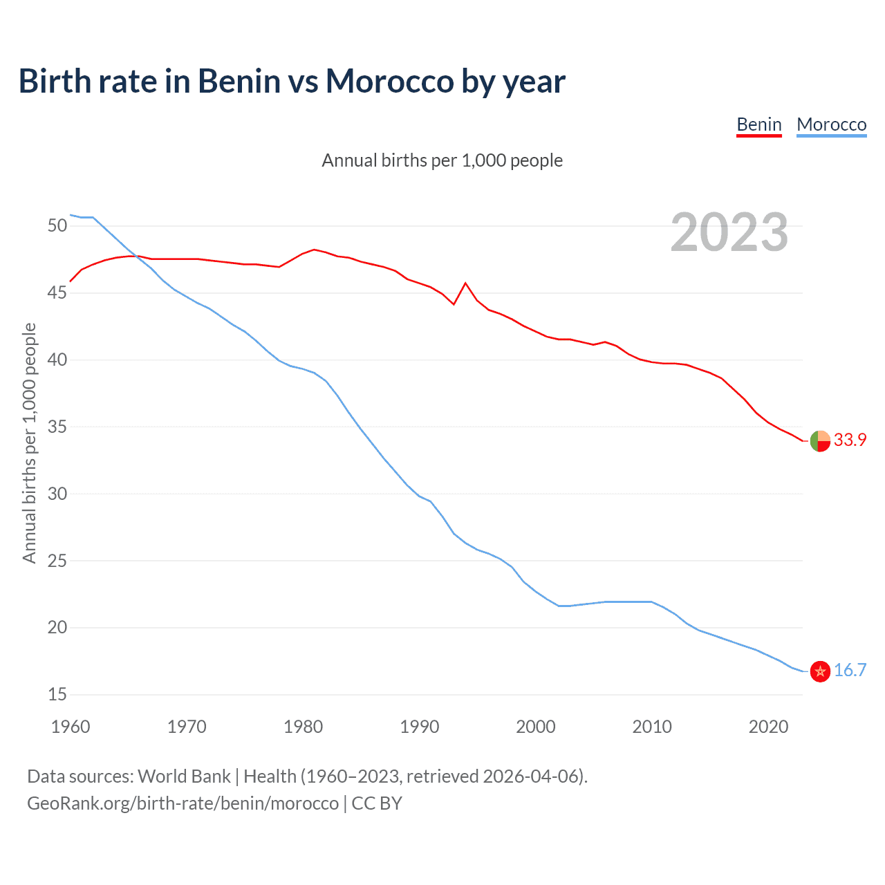 Benin has an annual birth rate of 33.9 births per 1,000 people, compared to 16.7 for Morocco. The average number of children a woman is expected to have during her lifetime — the fertility rate, is 4.56 in Benin and 2.23 in Morocco — 51.1% difference.