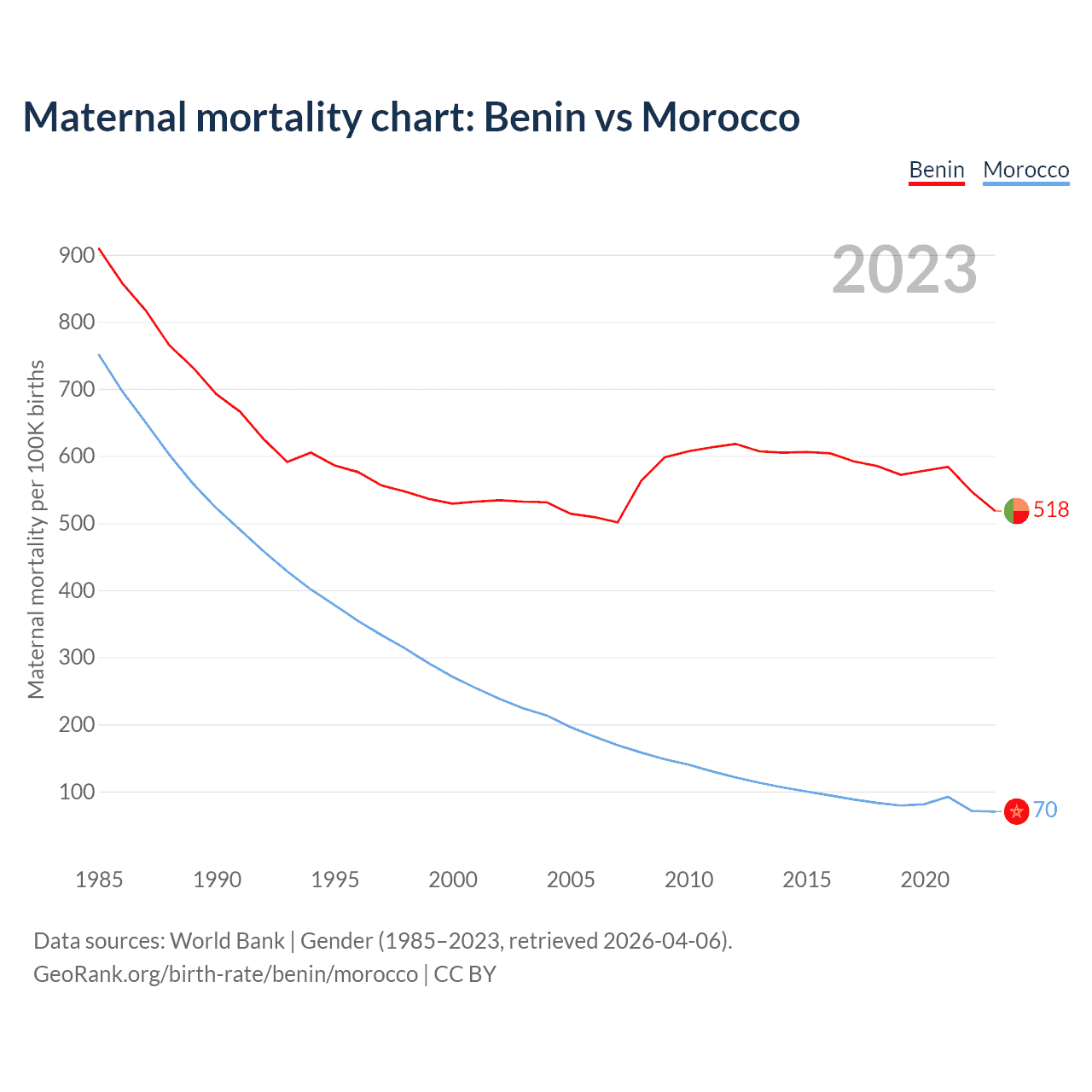 The maternal mortality rate, which is the probability of dying during childbirth or within 42 days of pregnancy termination, is 518 deaths per 100,000 live births in Benin, compared to 70 deaths in Morocco.