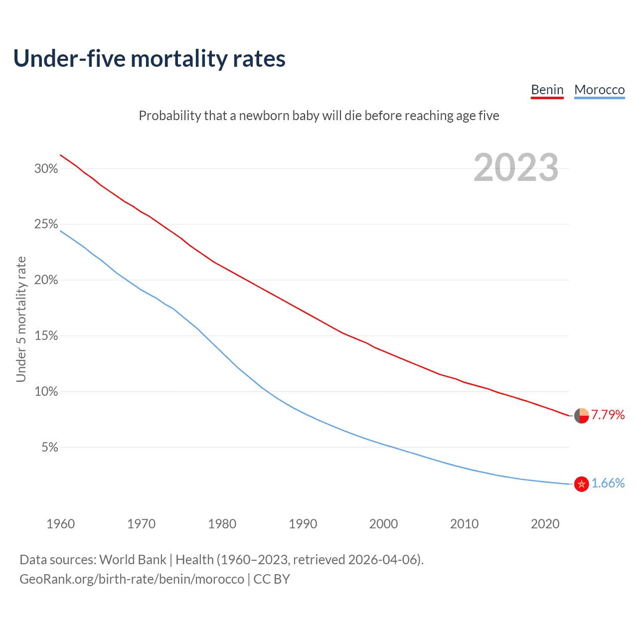 The chance that a newborn baby will die before reaching age five is 7.79% in Benin and 1.66% in Morocco. Above is a chart with historical data on under-five mortality rates.