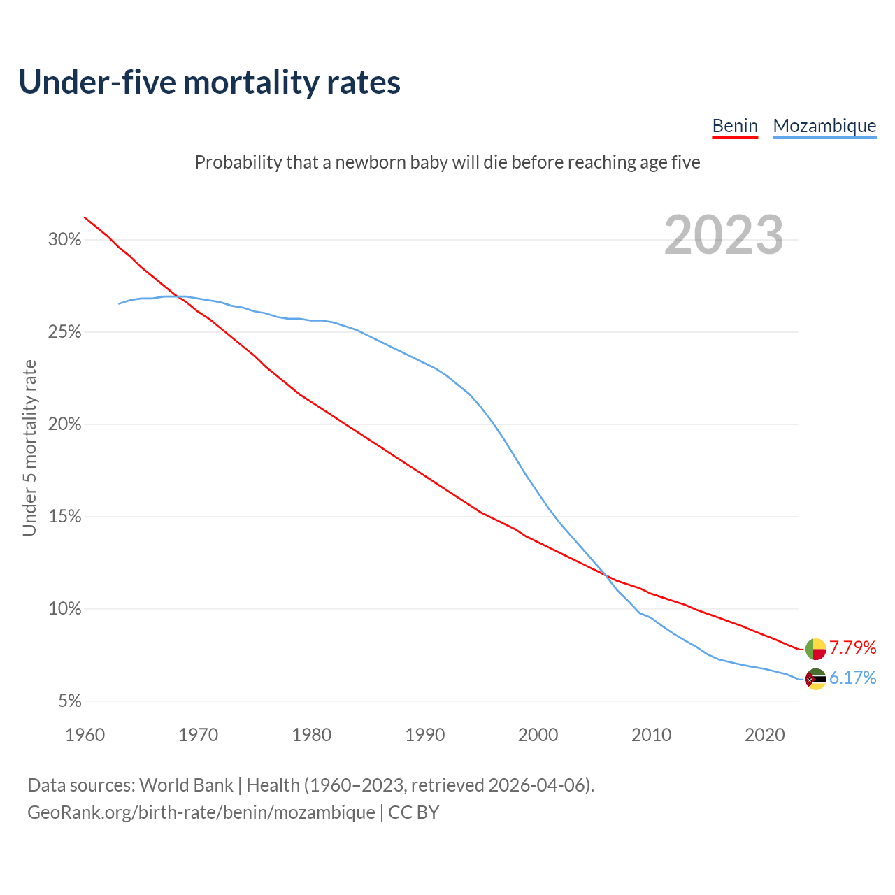The chance that a newborn baby will die before reaching age five is 7.79% in Benin and 6.17% in Mozambique. Above is a chart with historical data on under-five mortality rates.