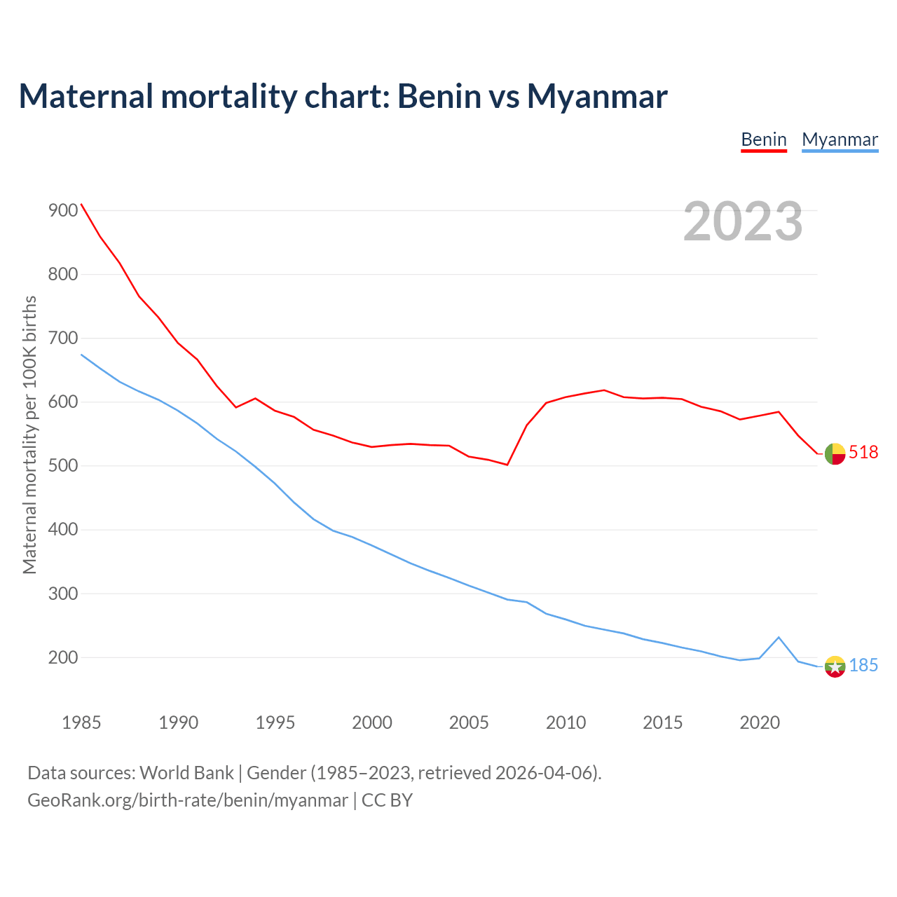 The maternal mortality rate, which is the probability of dying during childbirth or within 42 days of pregnancy termination, is 518 deaths per 100,000 live births in Benin, compared to 185 deaths in Myanmar.
