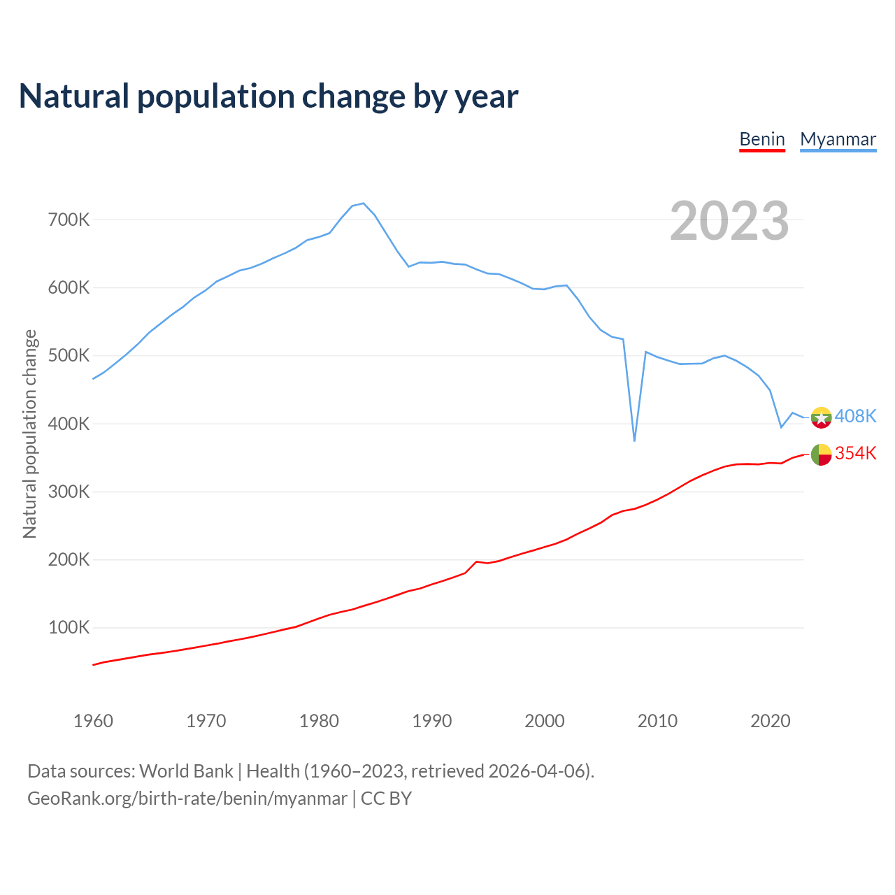 According to the latest available data on birth rates, the fertility rate in Benin was 4.56 children per woman in 2023, compared to 2.12 in Myanmar in 2023. The replacement level is considered to be 2.1 children per woman.