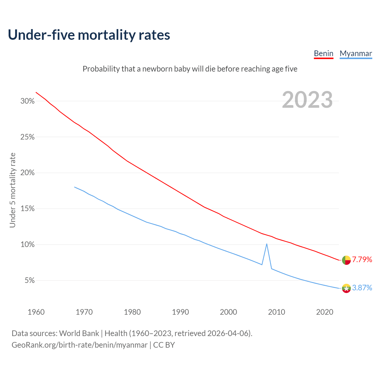 The chance that a newborn baby will die before reaching age five is 7.79% in Benin and 3.87% in Myanmar. Above is a chart with historical data on under-five mortality rates.