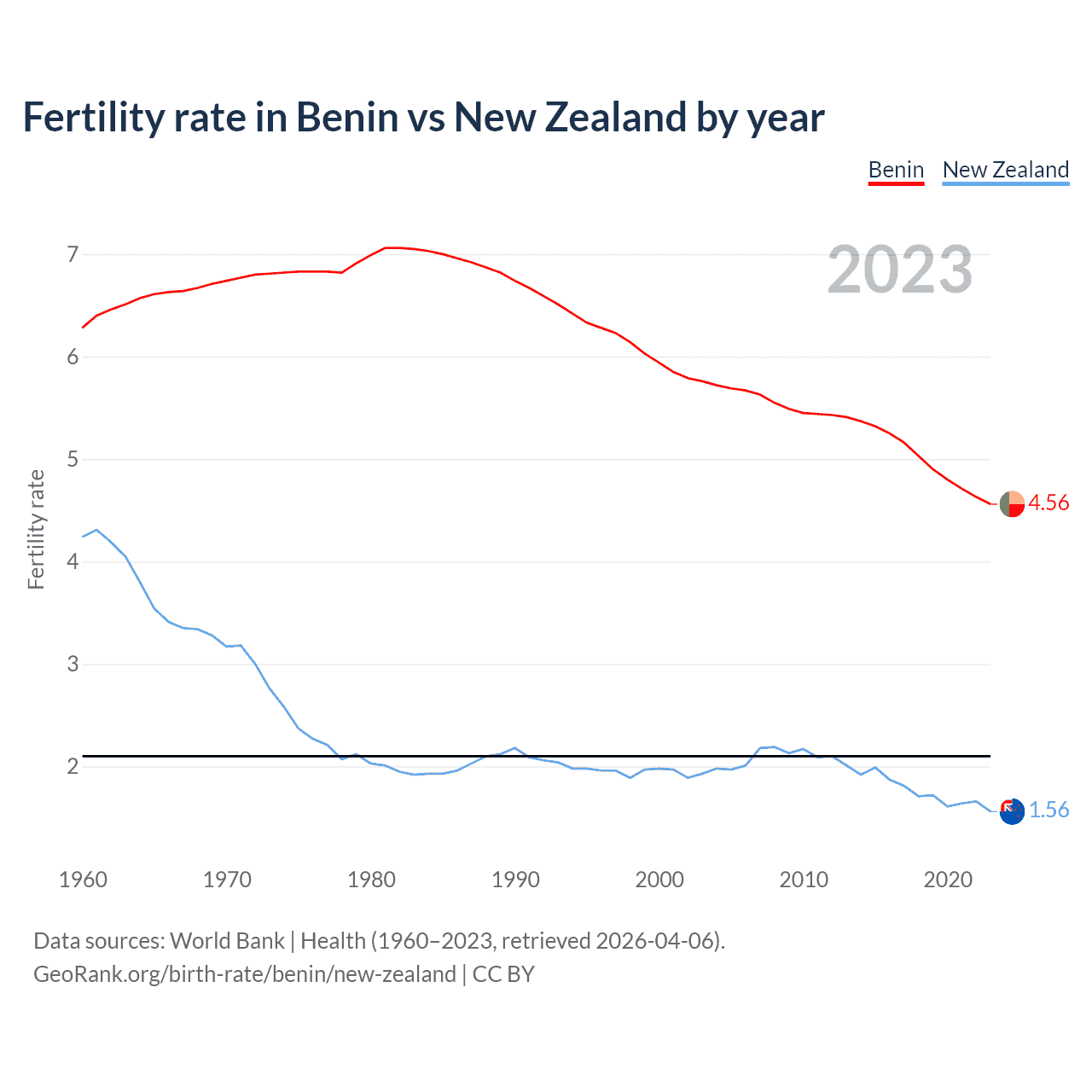 According to the latest available data on birth rates, the fertility rate in Benin was 4.56 children per woman in 2023, compared to 1.56 in New Zealand in 2023. The replacement level is considered to be 2.1 children per woman.