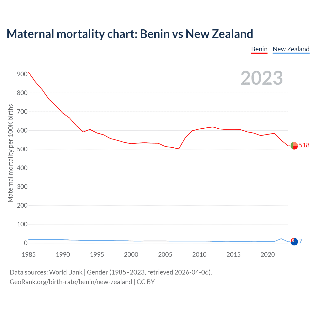 The maternal mortality rate, which is the probability of dying during childbirth or within 42 days of pregnancy termination, is 518 deaths per 100,000 live births in Benin, compared to 7 deaths in New Zealand.