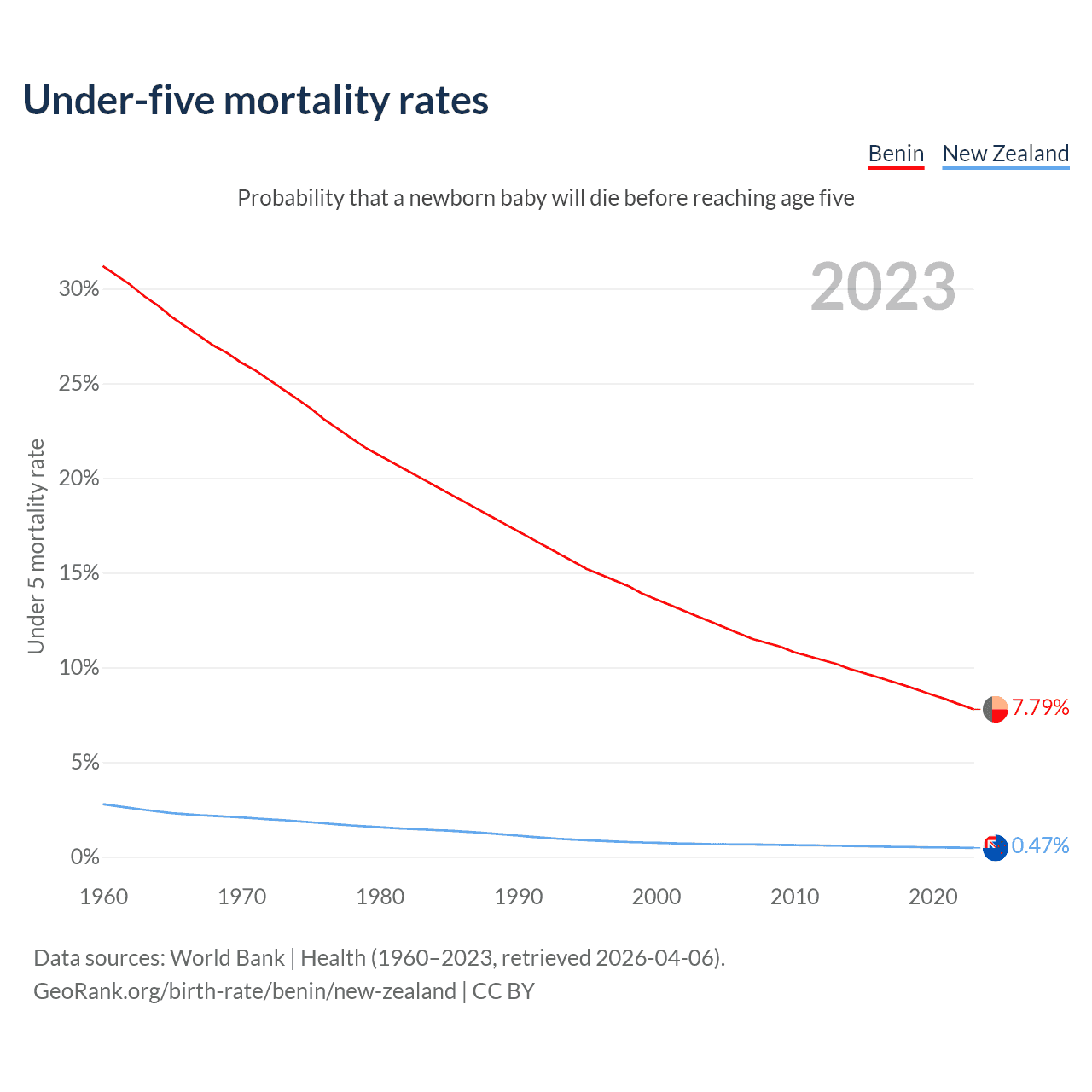 The chance that a newborn baby will die before reaching age five is 7.79% in Benin and 0.47% in New Zealand. Above is a chart with historical data on under-five mortality rates.