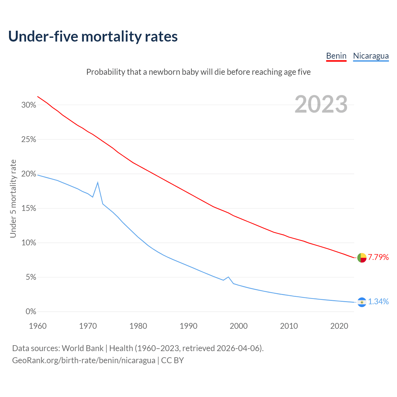 The chance that a newborn baby will die before reaching age five is 7.79% in Benin and 1.34% in Nicaragua. Above is a chart with historical data on under-five mortality rates.