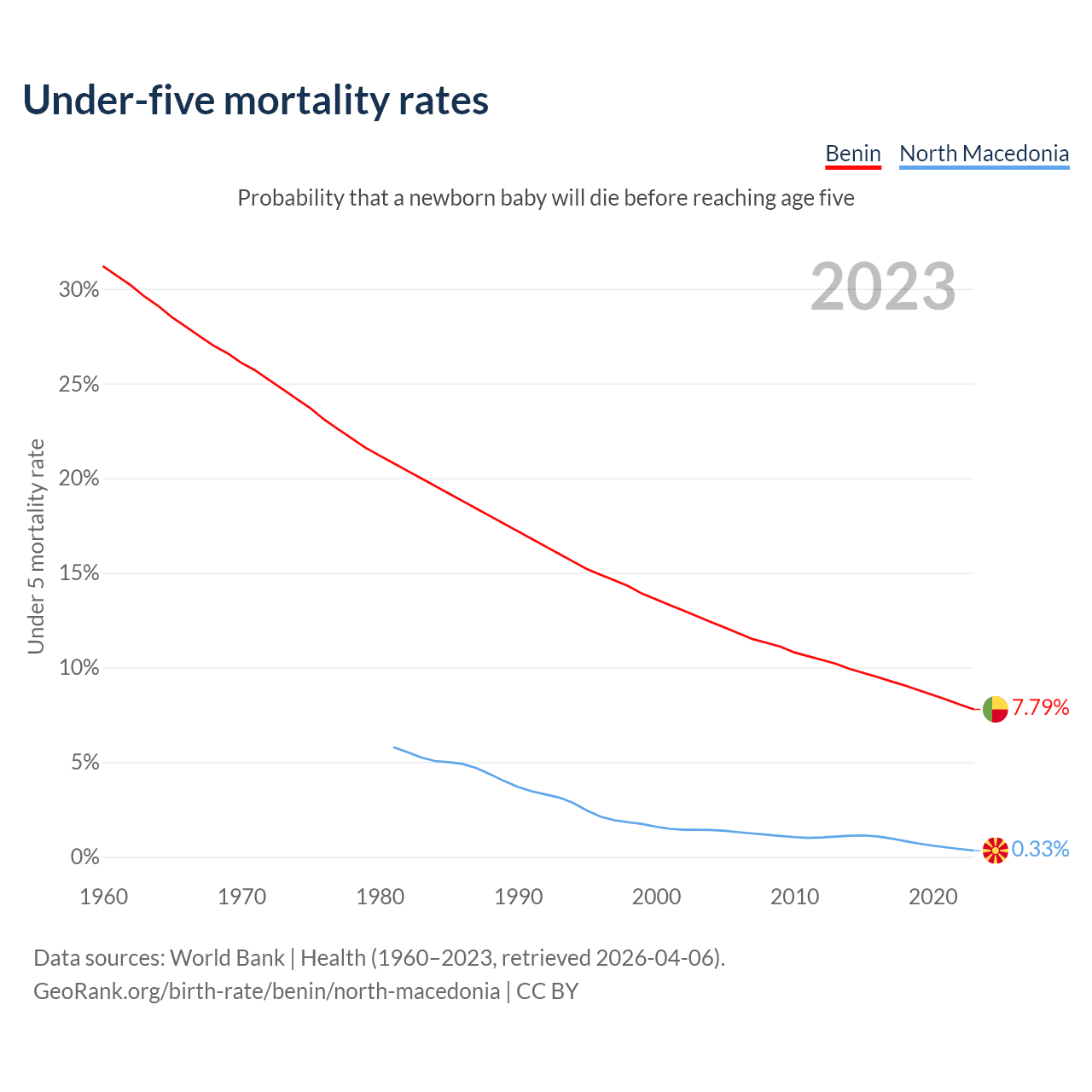 The chance that a newborn baby will die before reaching age five is 7.79% in Benin and 0.33% in North Macedonia. Above is a chart with historical data on under-five mortality rates.