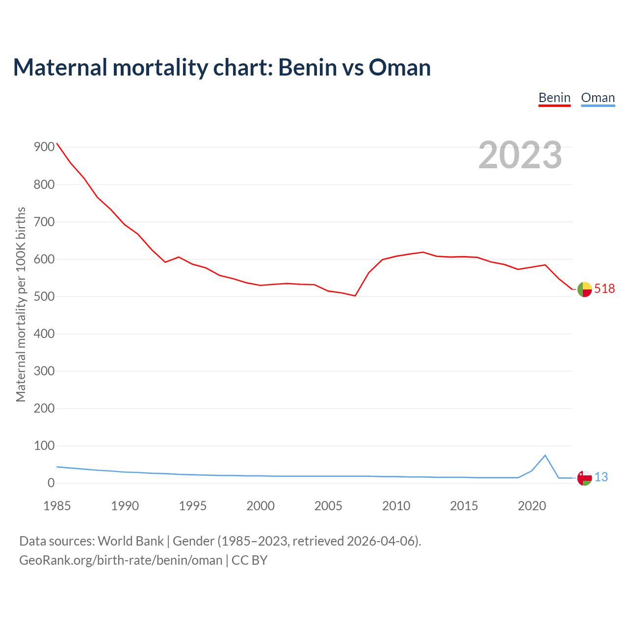 The maternal mortality rate, which is the probability of dying during childbirth or within 42 days of pregnancy termination, is 518 deaths per 100,000 live births in Benin, compared to 13 deaths in Oman.