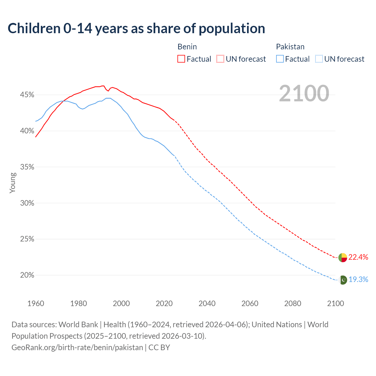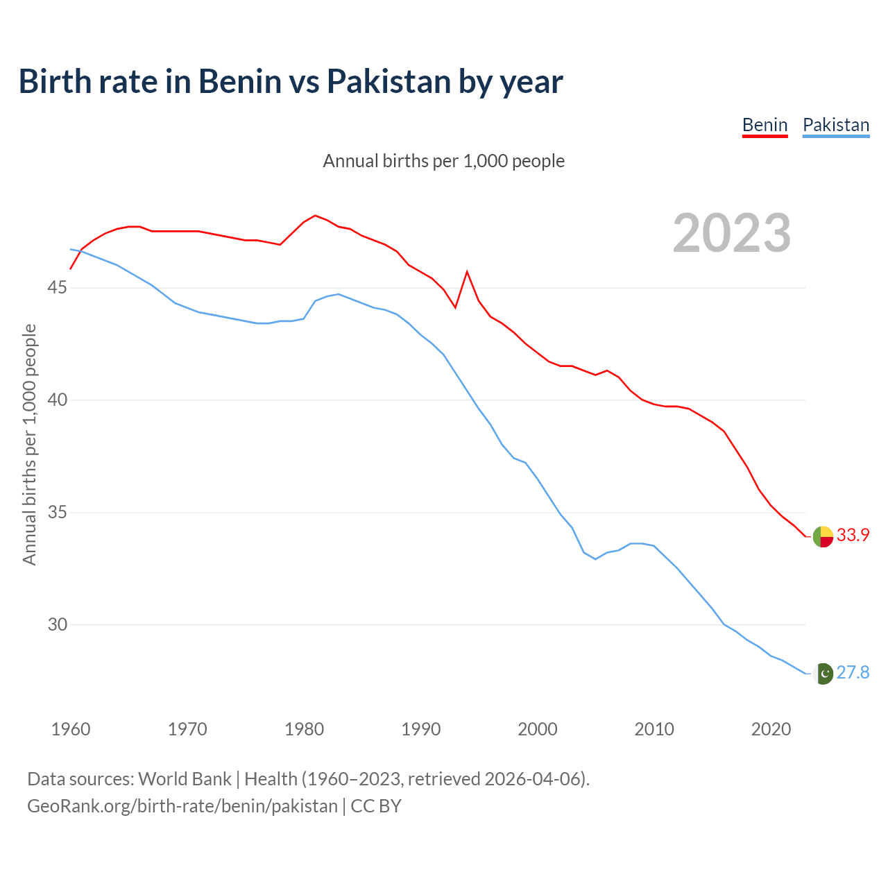 Benin has an annual birth rate of 33.9 births per 1,000 people, compared to 27.8 for Pakistan. The average number of children a woman is expected to have during her lifetime — the fertility rate, is 4.56 in Benin and 3.61 in Pakistan — 20.9% difference.