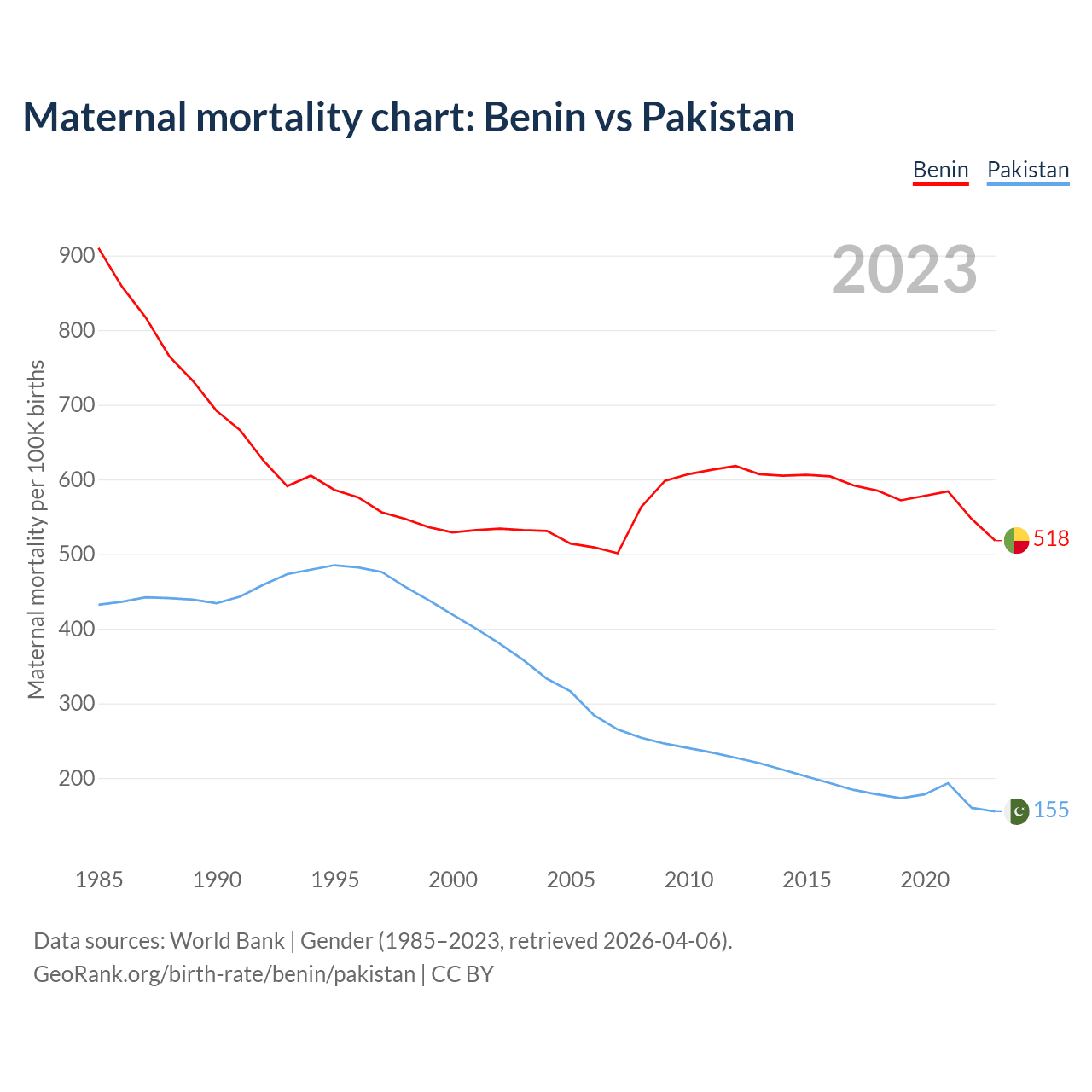 The maternal mortality rate, which is the probability of dying during childbirth or within 42 days of pregnancy termination, is 518 deaths per 100,000 live births in Benin, compared to 155 deaths in Pakistan.
