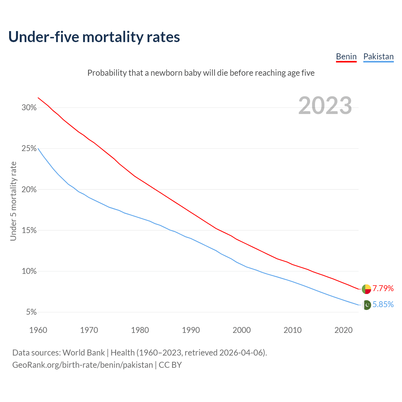 The chance that a newborn baby will die before reaching age five is 7.79% in Benin and 5.85% in Pakistan. Above is a chart with historical data on under-five mortality rates.
