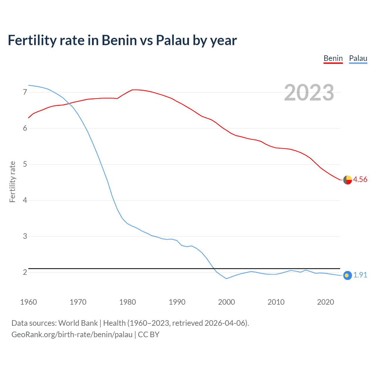 According to the latest available data on birth rates, the fertility rate in Benin was 4.56 children per woman in 2023, compared to 1.91 in Palau in 2023. The replacement level is considered to be 2.1 children per woman.