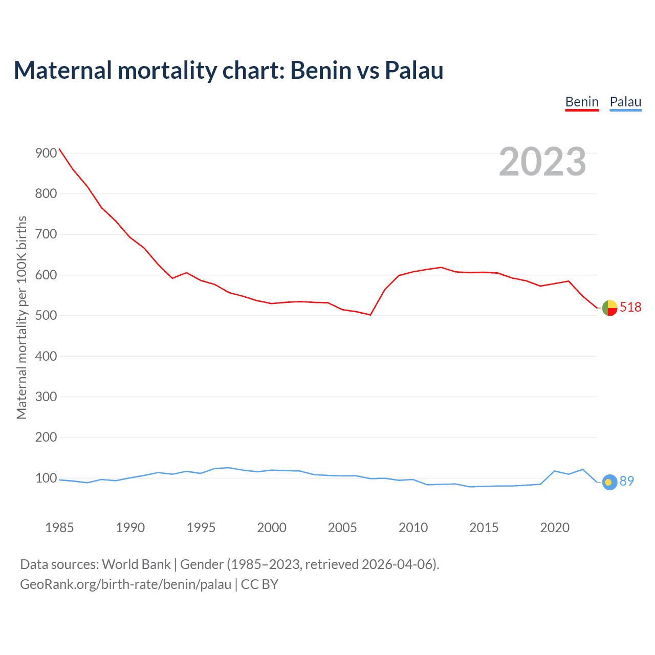 The maternal mortality rate, which is the probability of dying during childbirth or within 42 days of pregnancy termination, is 518 deaths per 100,000 live births in Benin, compared to 89 deaths in Palau.