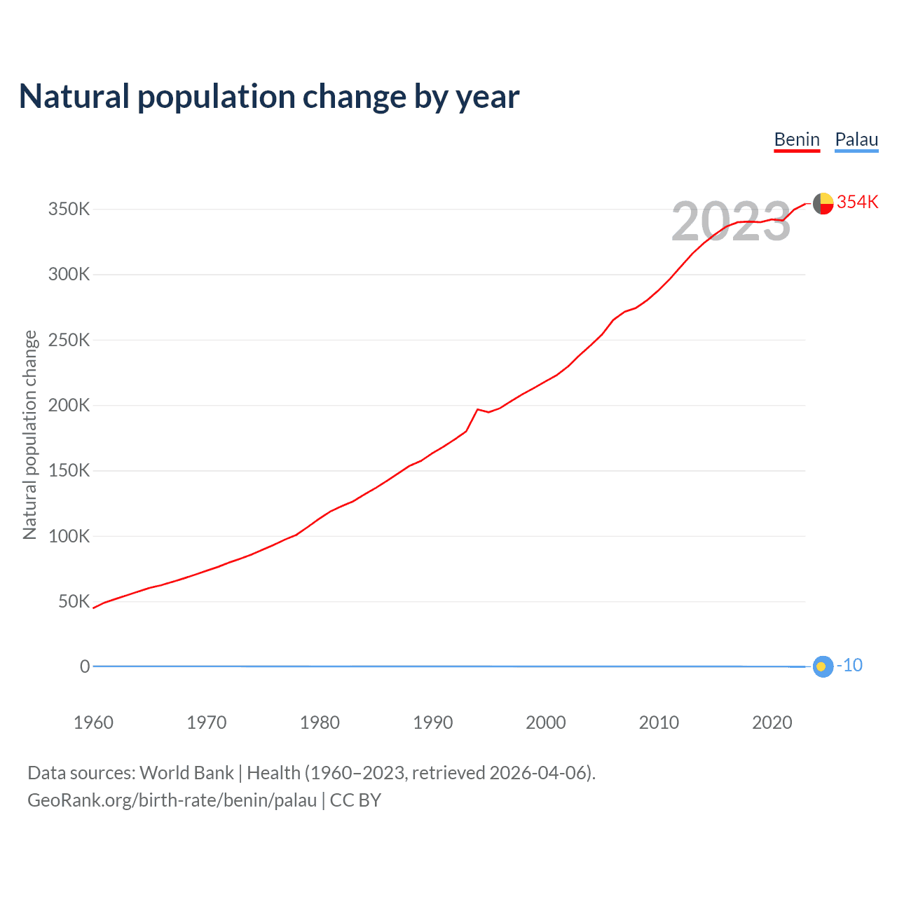 Benin has an annual birth rate of 33.9 births per 1,000 people, compared to 10.9 for Palau. The average number of children a woman is expected to have during her lifetime — the fertility rate, is 4.56 in Benin and 1.91 in Palau — 58.1% difference.