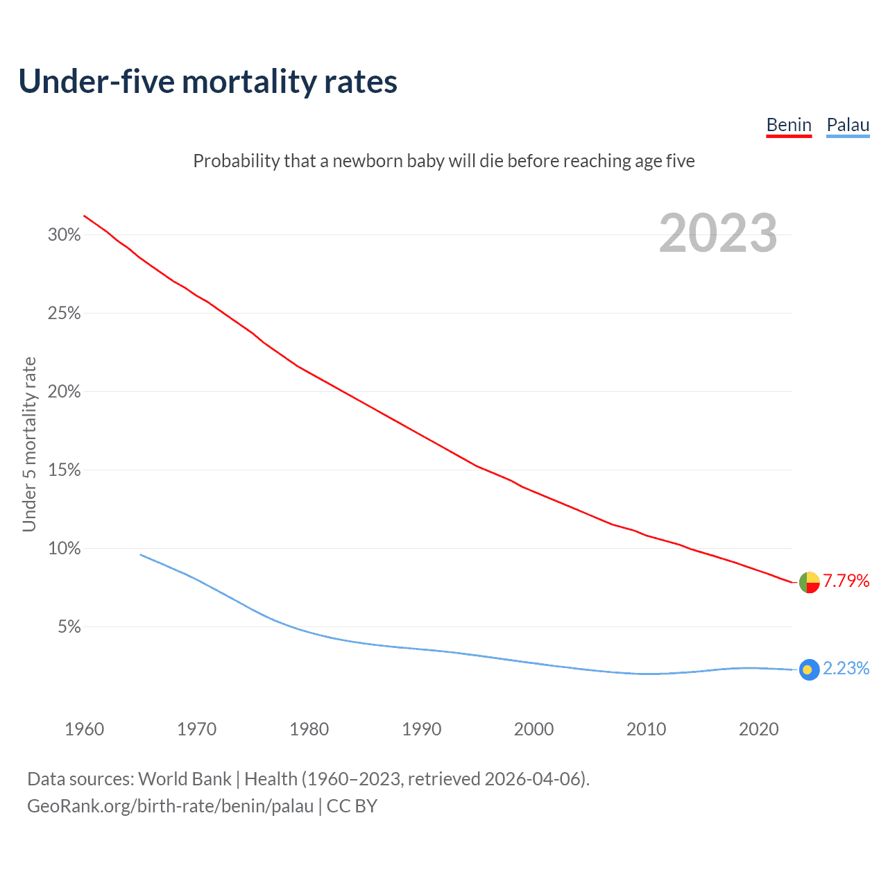 The chance that a newborn baby will die before reaching age five is 7.79% in Benin and 2.23% in Palau. Above is a chart with historical data on under-five mortality rates.