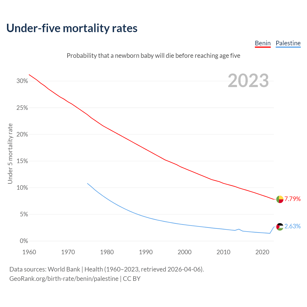 The chance that a newborn baby will die before reaching age five is 7.79% in Benin and 2.63% in Palestine. Above is a chart with historical data on under-five mortality rates.