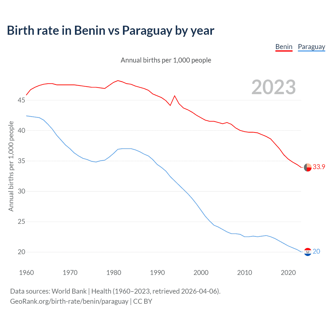 According to the latest available data on birth rates, the fertility rate in Benin was 4.56 children per woman in 2023, compared to 2.42 in Paraguay in 2023. The replacement level is considered to be 2.1 children per woman.