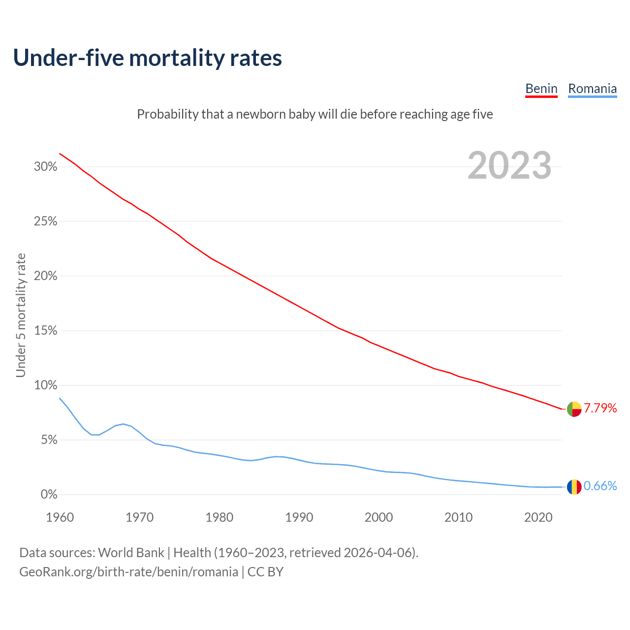 The chance that a newborn baby will die before reaching age five is 7.79% in Benin and 0.66% in Romania. Above is a chart with historical data on under-five mortality rates.