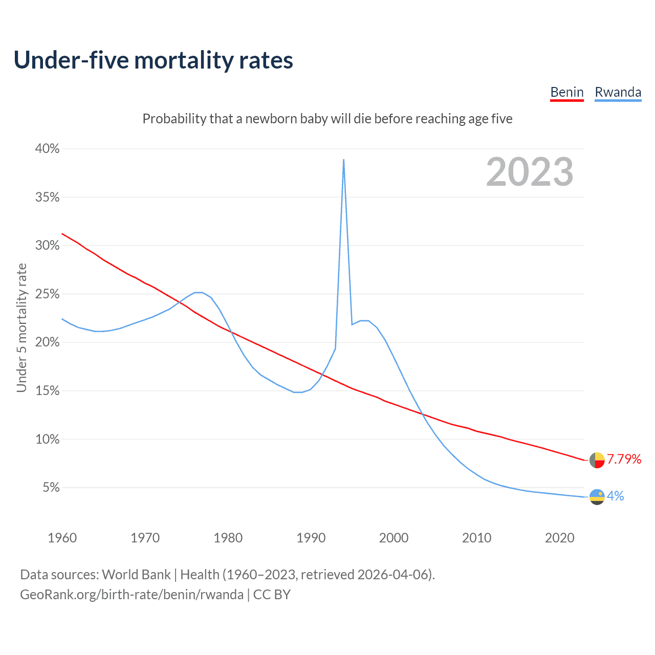 The chance that a newborn baby will die before reaching age five is 7.79% in Benin and 4% in Rwanda. Above is a chart with historical data on under-five mortality rates.