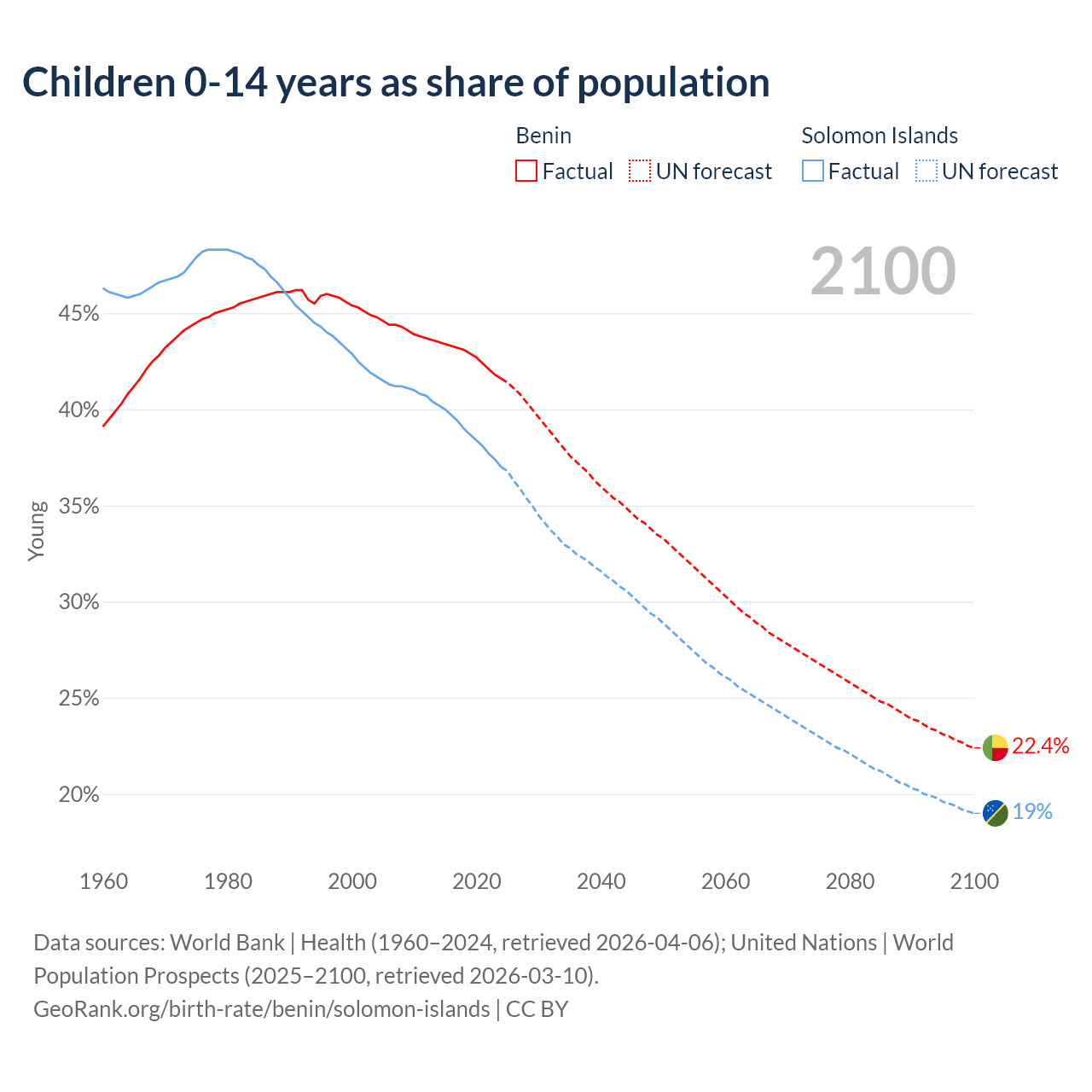 According to the latest available data on birth rates, the fertility rate in Benin was 4.56 children per woman in 2023, compared to 3.56 in the Solomon Islands in 2023. The replacement level is considered to be 2.1 children per woman.