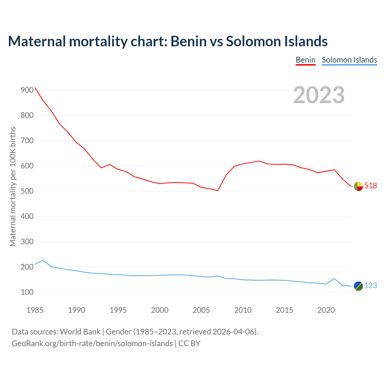The maternal mortality rate, which is the probability of dying during childbirth or within 42 days of pregnancy termination, is 518 deaths per 100,000 live births in Benin, compared to 123 deaths in the Solomon Islands.