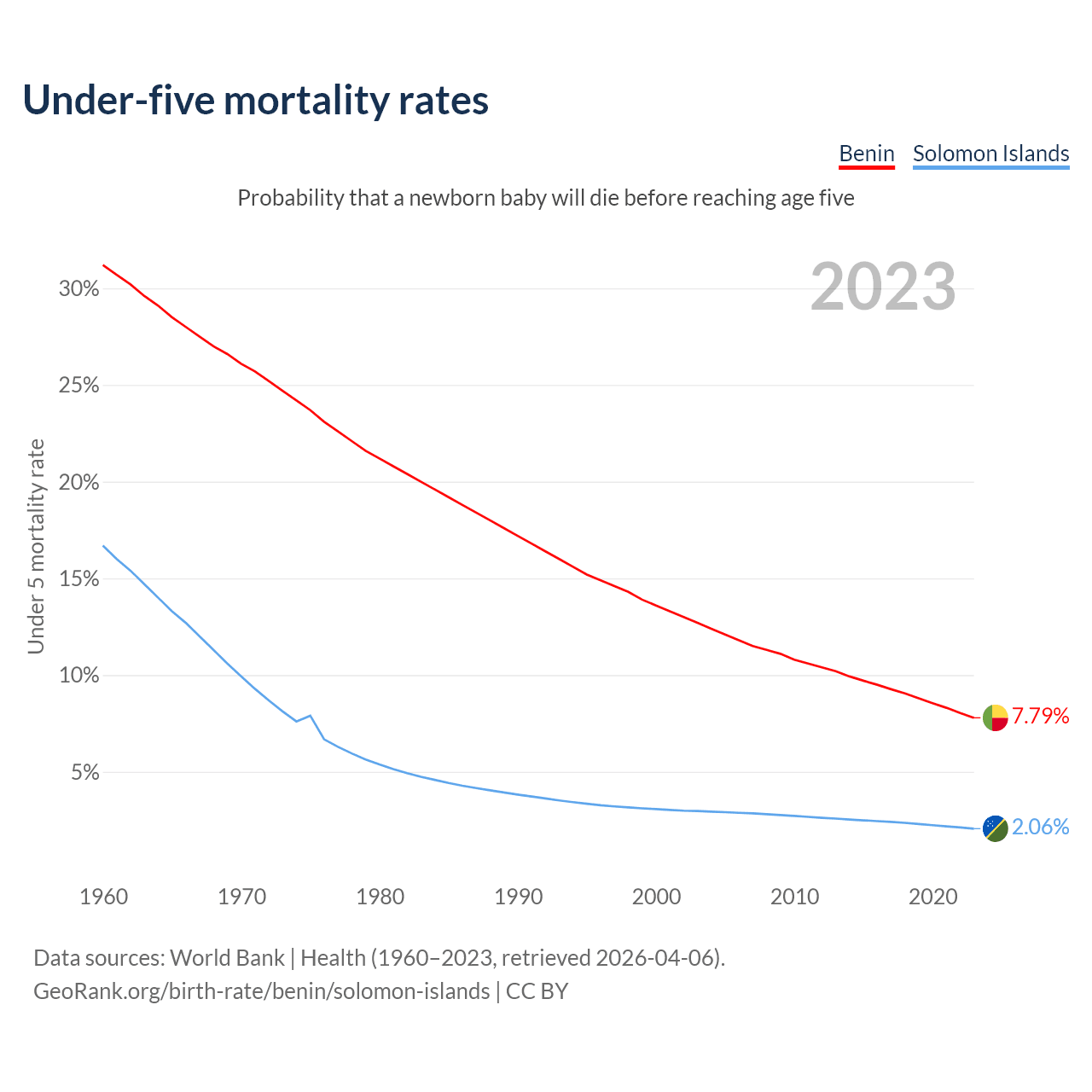 The chance that a newborn baby will die before reaching age five is 7.79% in Benin and 2.06% in the Solomon Islands. Above is a chart with historical data on under-five mortality rates.