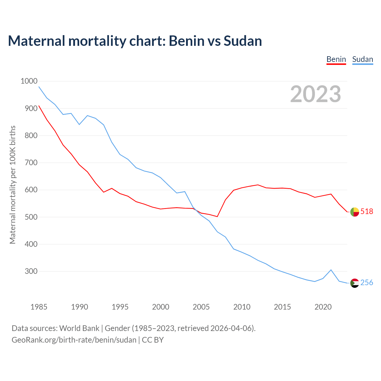 The maternal mortality rate, which is the probability of dying during childbirth or within 42 days of pregnancy termination, is 518 deaths per 100,000 live births in Benin, compared to 256 deaths in Sudan.