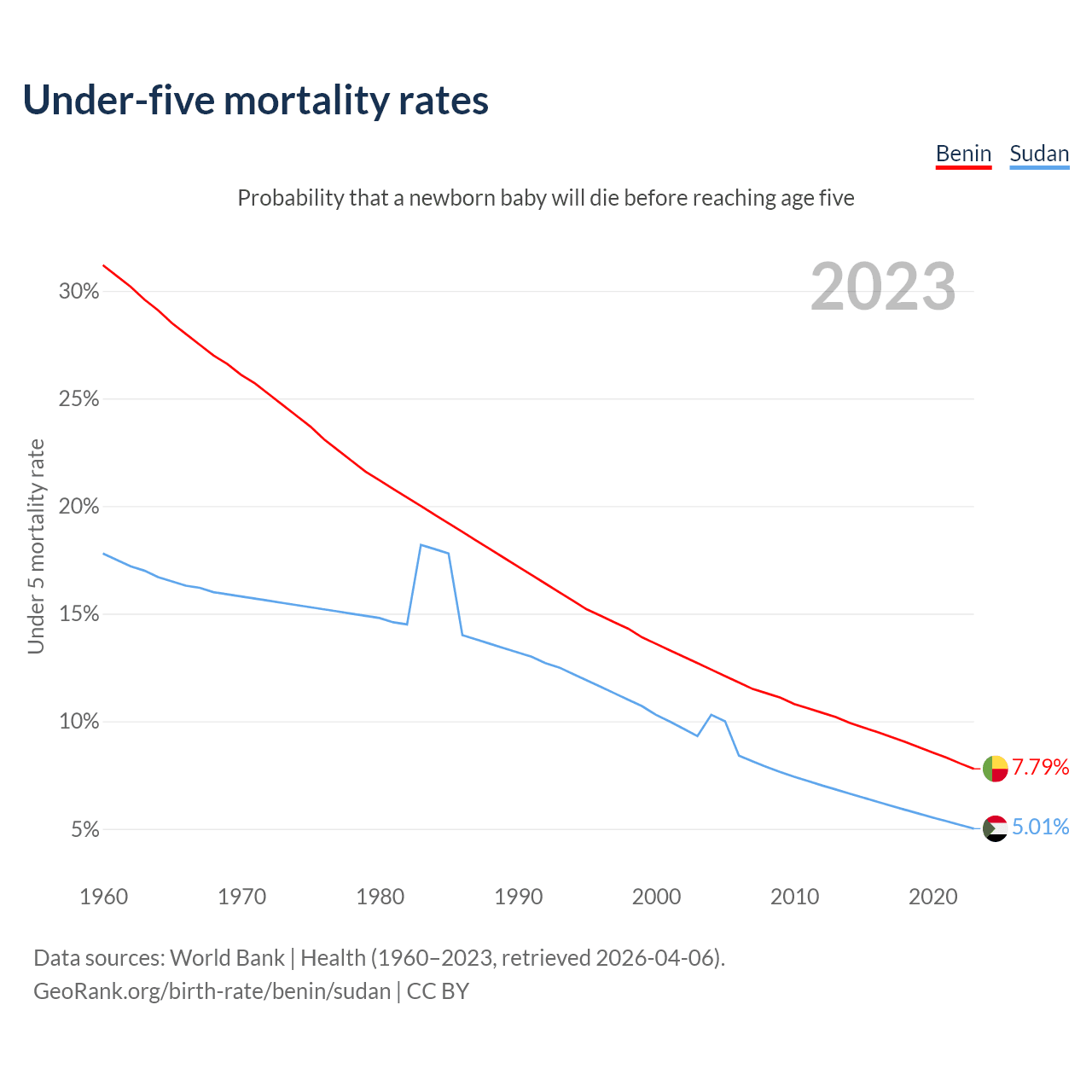 The chance that a newborn baby will die before reaching age five is 7.79% in Benin and 5.01% in Sudan. Above is a chart with historical data on under-five mortality rates.