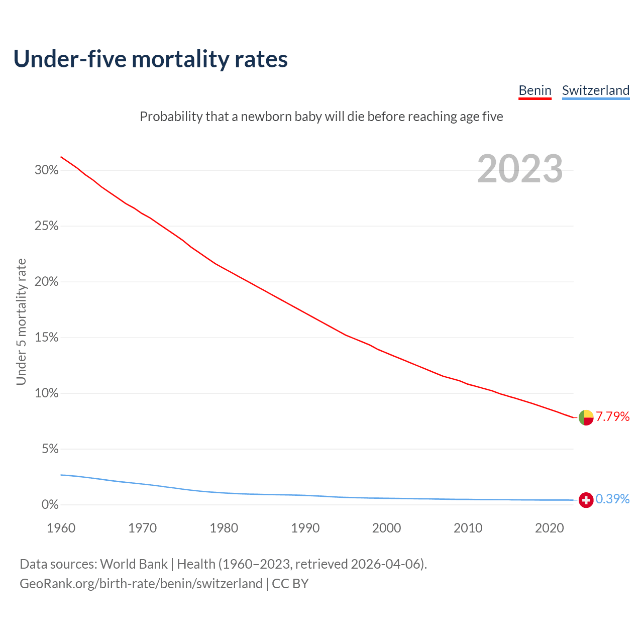 The chance that a newborn baby will die before reaching age five is 7.79% in Benin and 0.39% in Switzerland. Above is a chart with historical data on under-five mortality rates.
