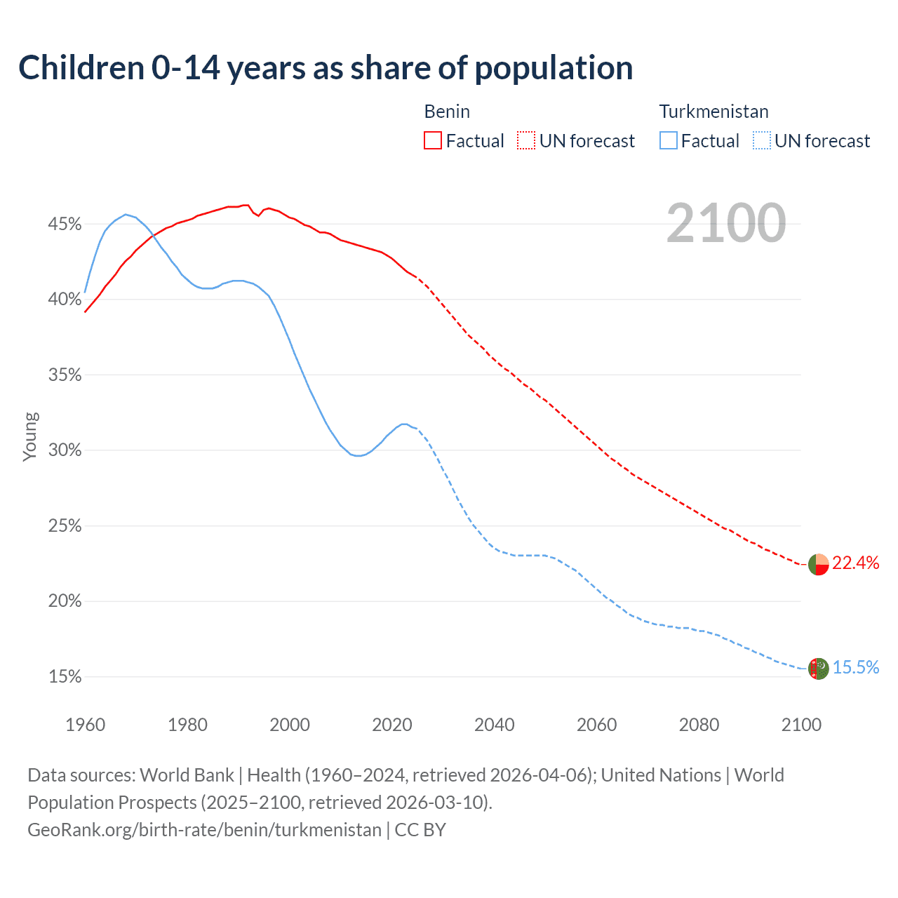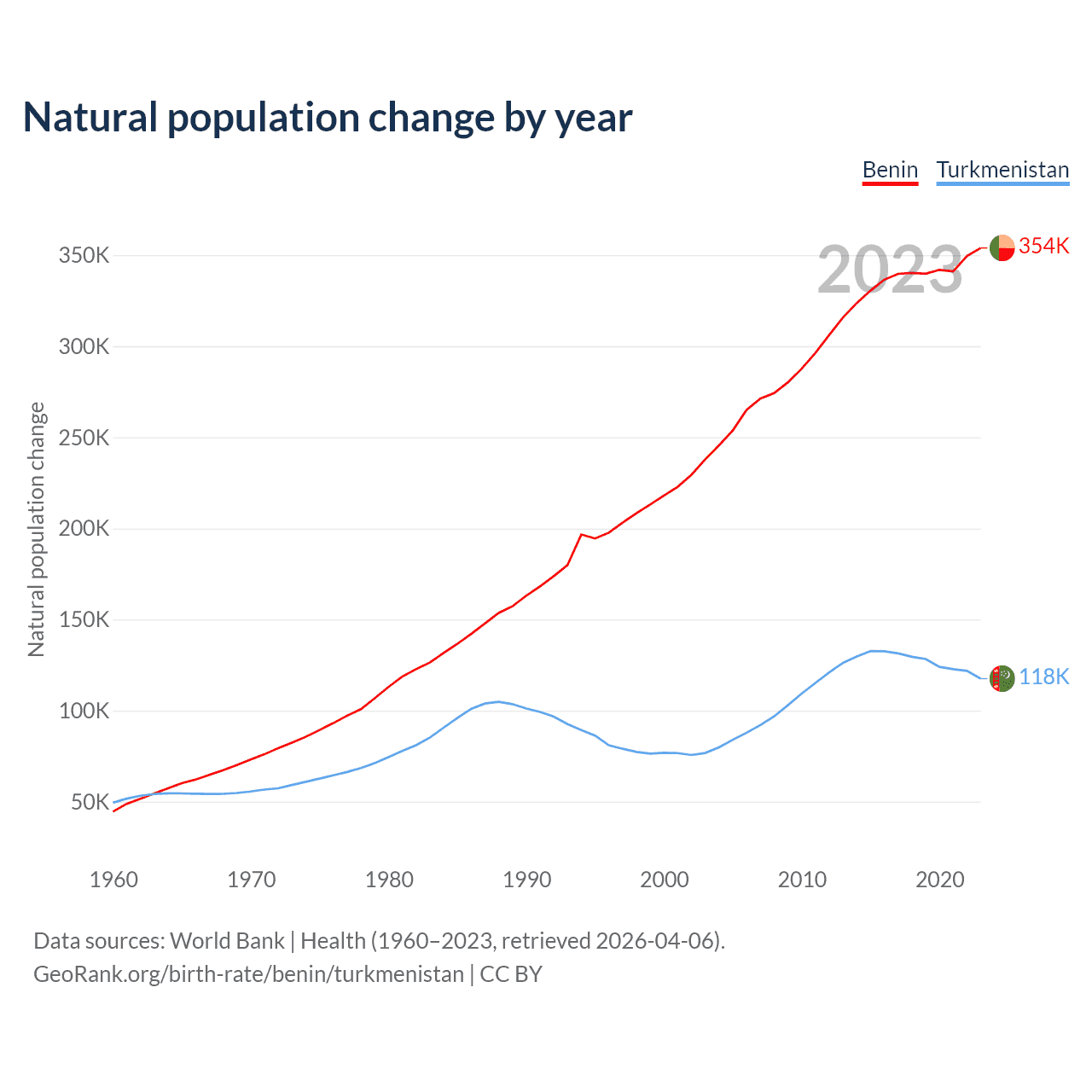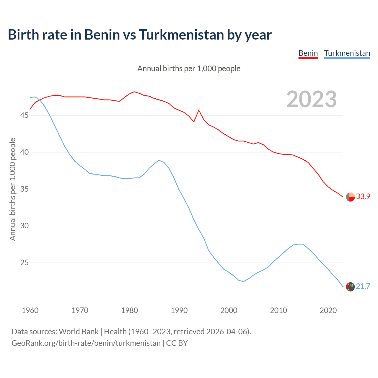 Benin has an annual birth rate of 33.9 births per 1,000 people, compared to 21.7 for Turkmenistan. The average number of children a woman is expected to have during her lifetime — the fertility rate, is 4.56 in Benin and 2.69 in Turkmenistan — 41% difference.