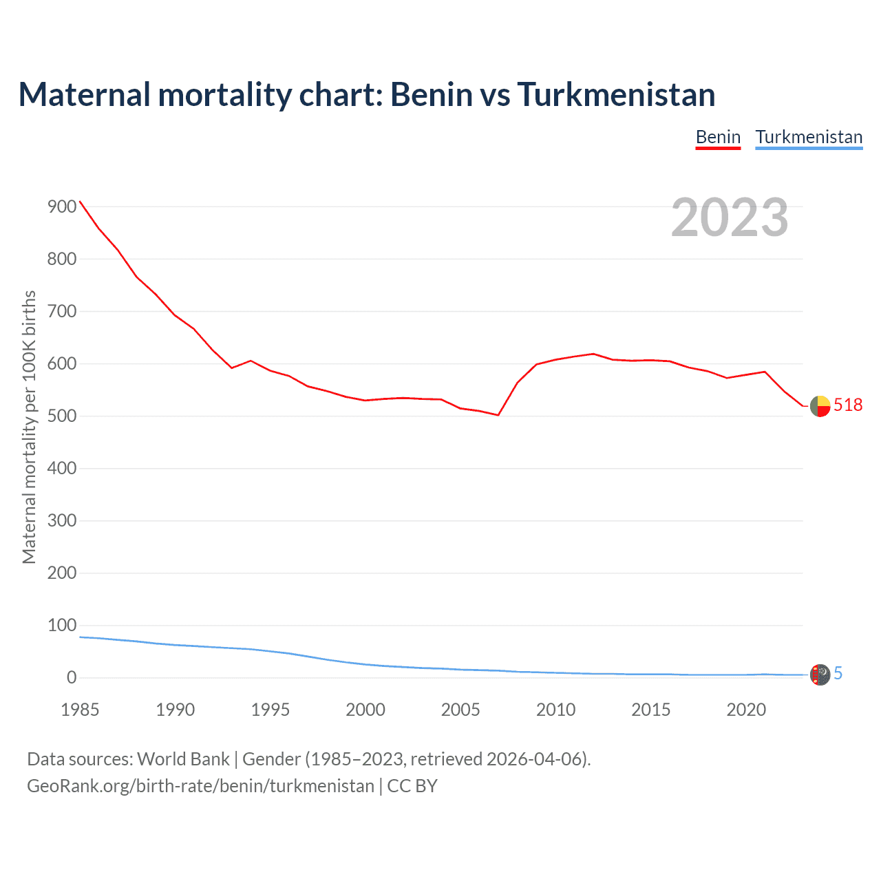 The maternal mortality rate, which is the probability of dying during childbirth or within 42 days of pregnancy termination, is 518 deaths per 100,000 live births in Benin, compared to 5 deaths in Turkmenistan.