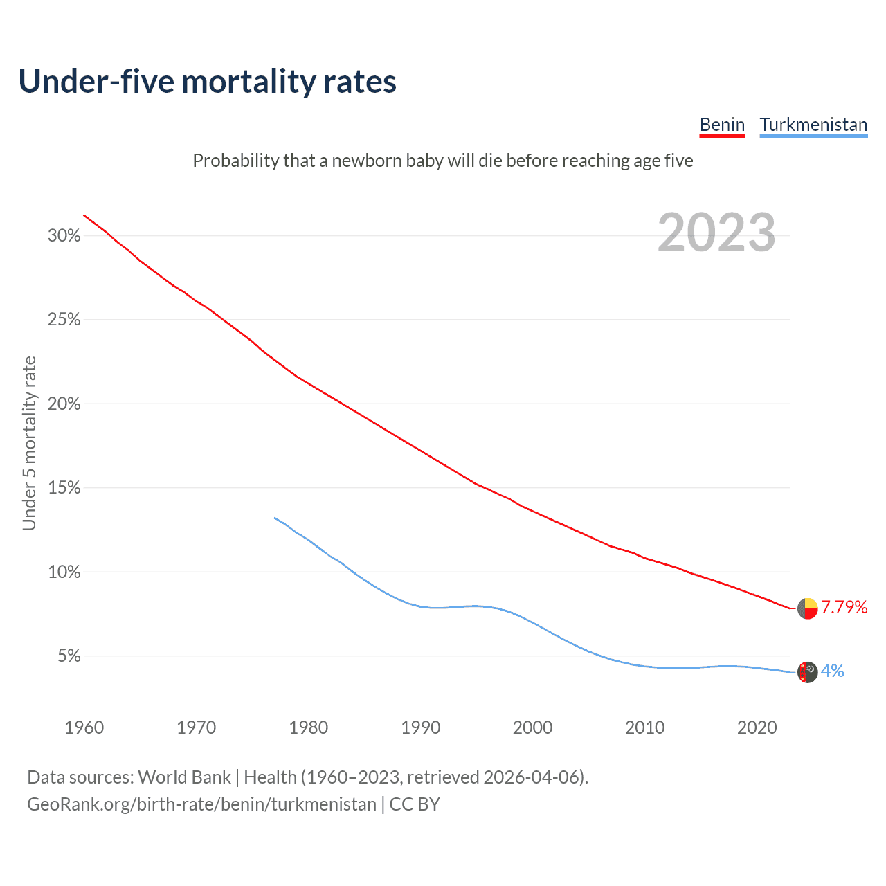 The chance that a newborn baby will die before reaching age five is 7.79% in Benin and 4% in Turkmenistan. Above is a chart with historical data on under-five mortality rates.