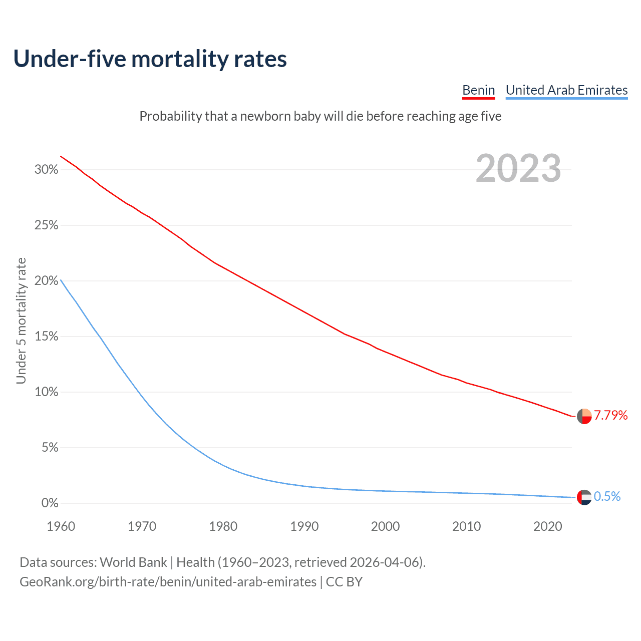 The chance that a newborn baby will die before reaching age five is 7.79% in Benin and 0.5% in the United Arab Emirates. Above is a chart with historical data on under-five mortality rates.