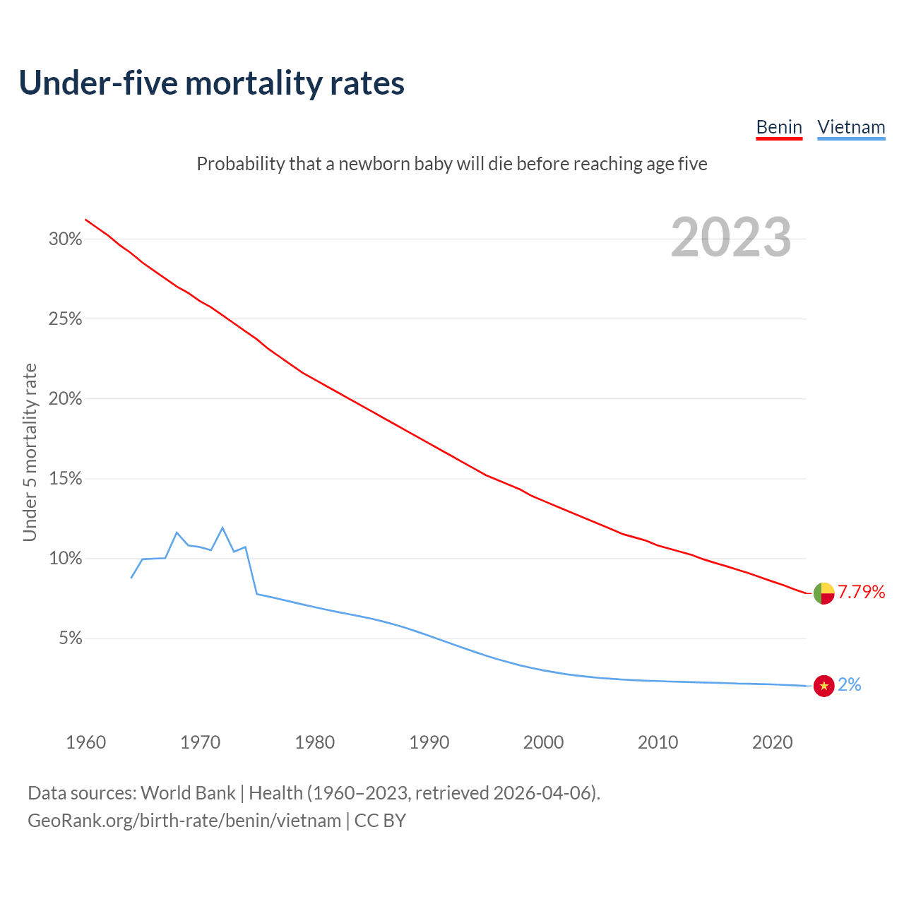 The chance that a newborn baby will die before reaching age five is 7.79% in Benin and 2% in Vietnam. Above is a chart with historical data on under-five mortality rates.
