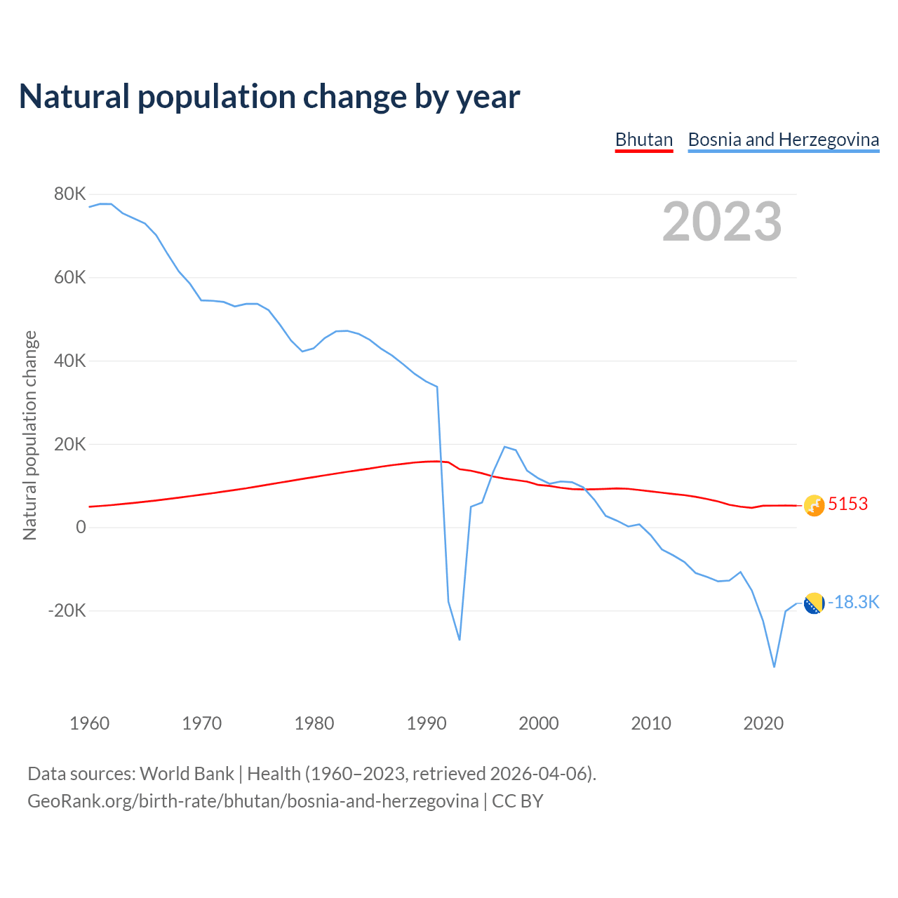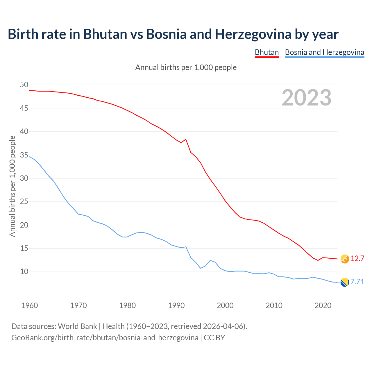 Bhutan has an annual birth rate of 12.7 births per 1,000 people, compared to 7.71 for Bosnia and Herzegovina. The average number of children a woman is expected to have during her lifetime — the fertility rate, is 1.46 in Bhutan and 1.49 in Bosnia and Herzegovina — 1.64% difference.