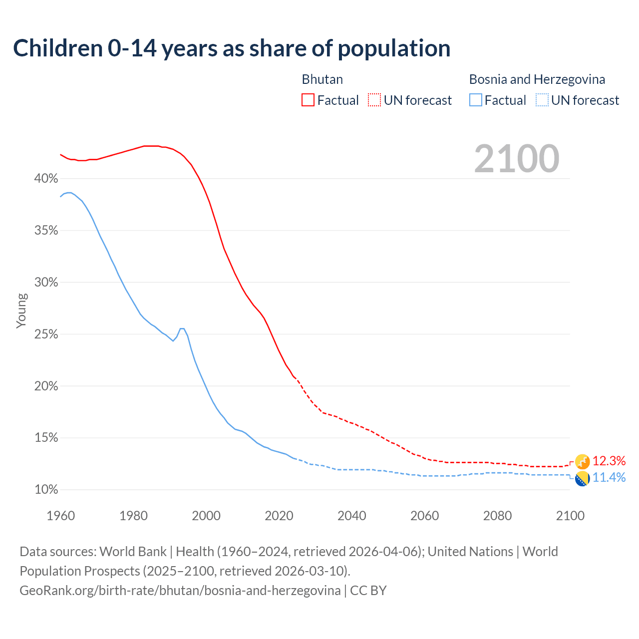 According to the latest available data on birth rates, the fertility rate in Bhutan was 1.46 children per woman in 2023, compared to 1.49 in Bosnia and Herzegovina in 2023. The replacement level is considered to be 2.1 children per woman.