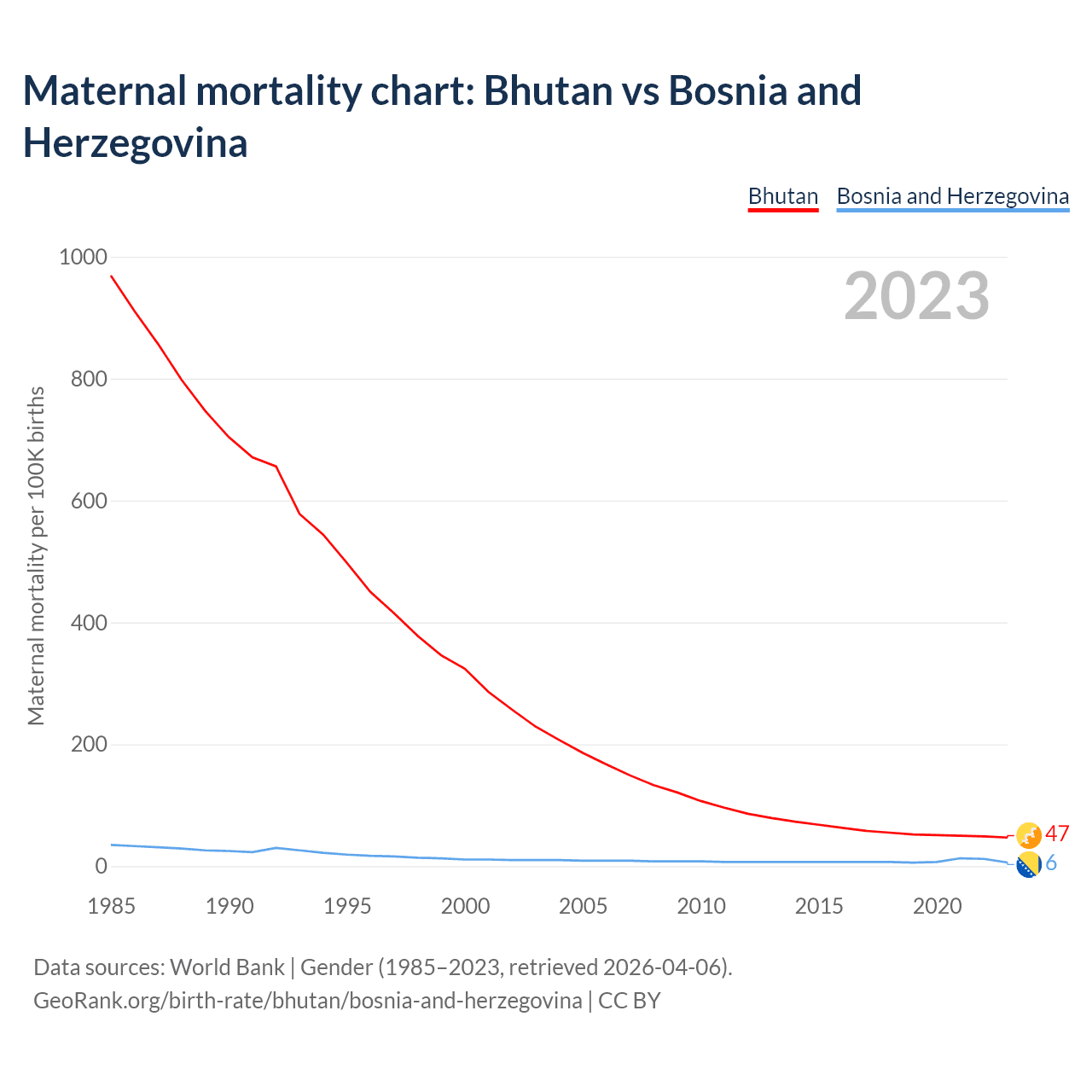 The maternal mortality rate, which is the probability of dying during childbirth or within 42 days of pregnancy termination, is 47 deaths per 100,000 live births in Bhutan, compared to 6 deaths in Bosnia and Herzegovina.
