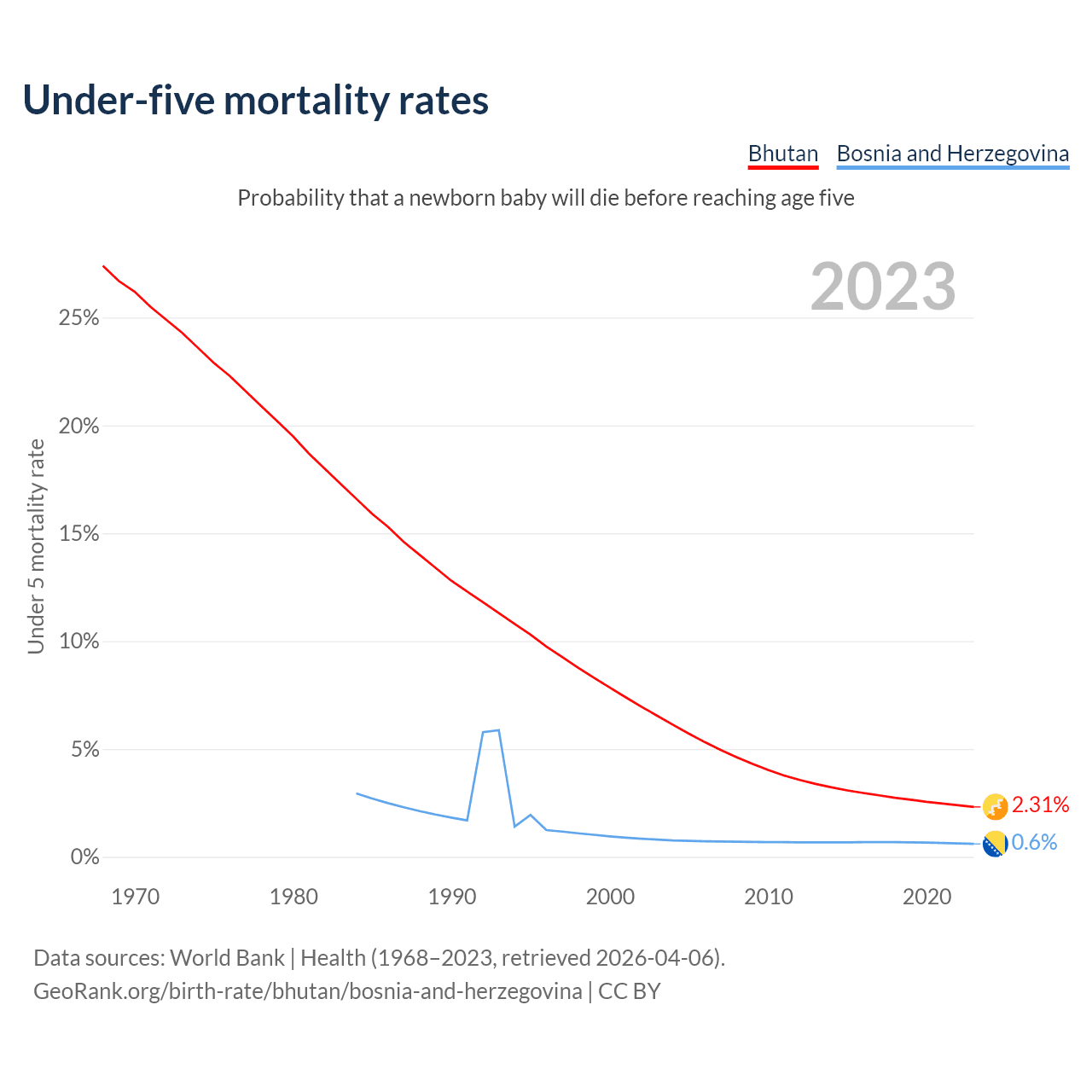 The chance that a newborn baby will die before reaching age five is 2.31% in Bhutan and 0.6% in Bosnia and Herzegovina. Above is a chart with historical data on under-five mortality rates.