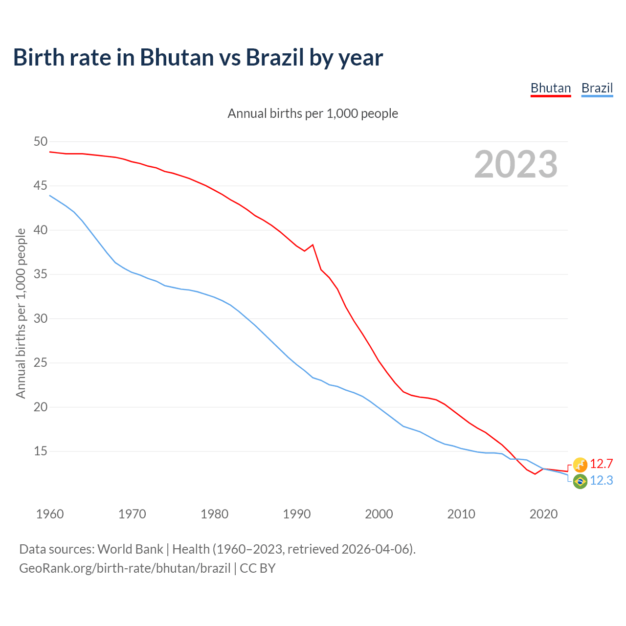 Bhutan has an annual birth rate of 12.7 births per 1,000 people, compared to 12.3 for Brazil. The average number of children a woman is expected to have during her lifetime — the fertility rate, is 1.46 in Bhutan and 1.62 in Brazil — 10.7% difference.