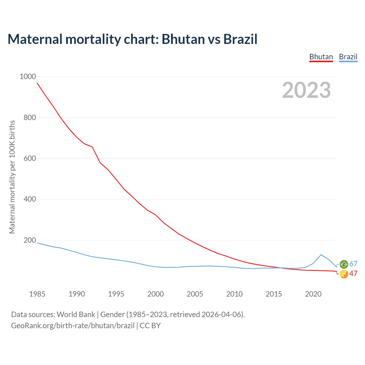 The maternal mortality rate, which is the probability of dying during childbirth or within 42 days of pregnancy termination, is 47 deaths per 100,000 live births in Bhutan, compared to 67 deaths in Brazil.