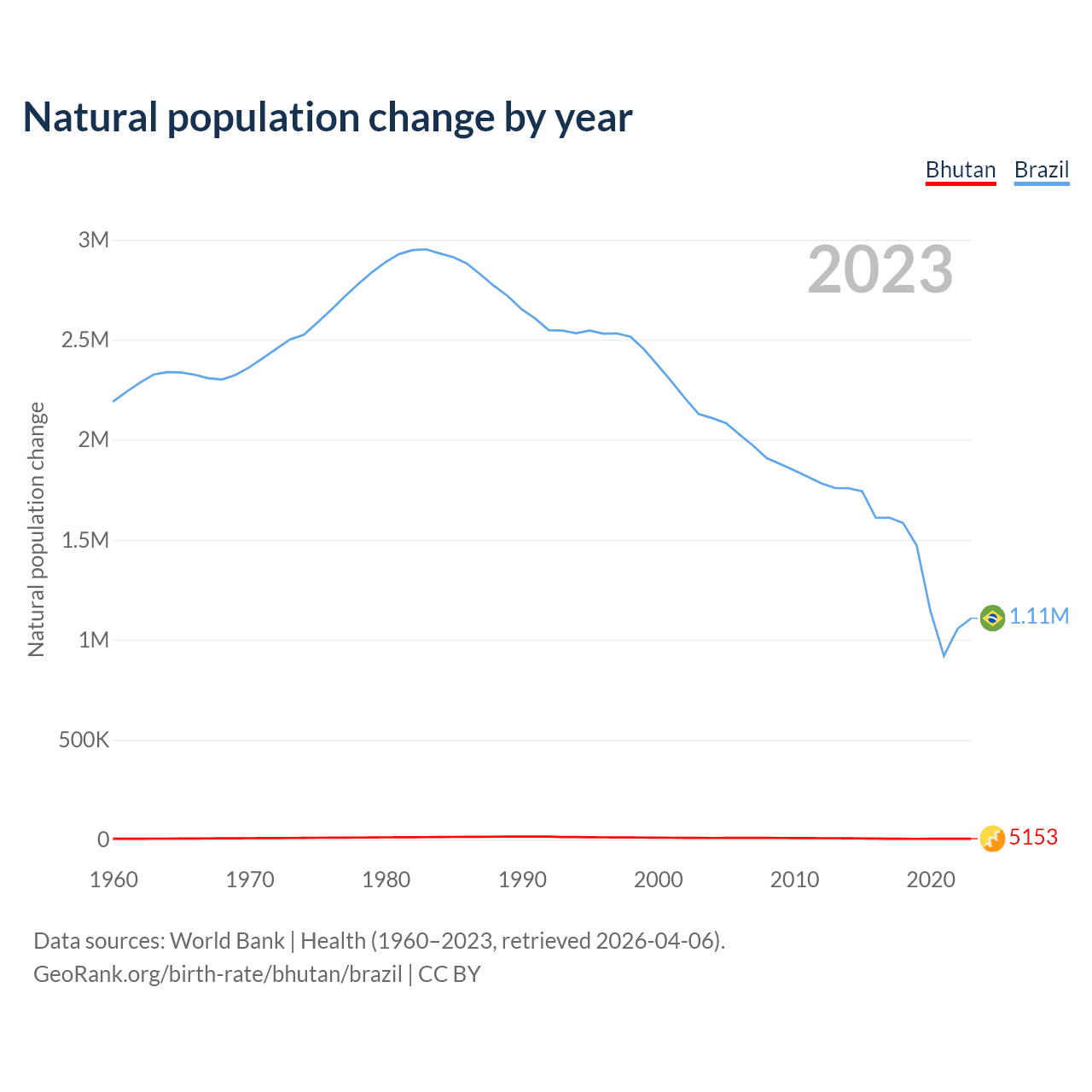 According to the latest available data on birth rates, the fertility rate in Bhutan was 1.46 children per woman in 2023, compared to 1.62 in Brazil in 2023. The replacement level is considered to be 2.1 children per woman.