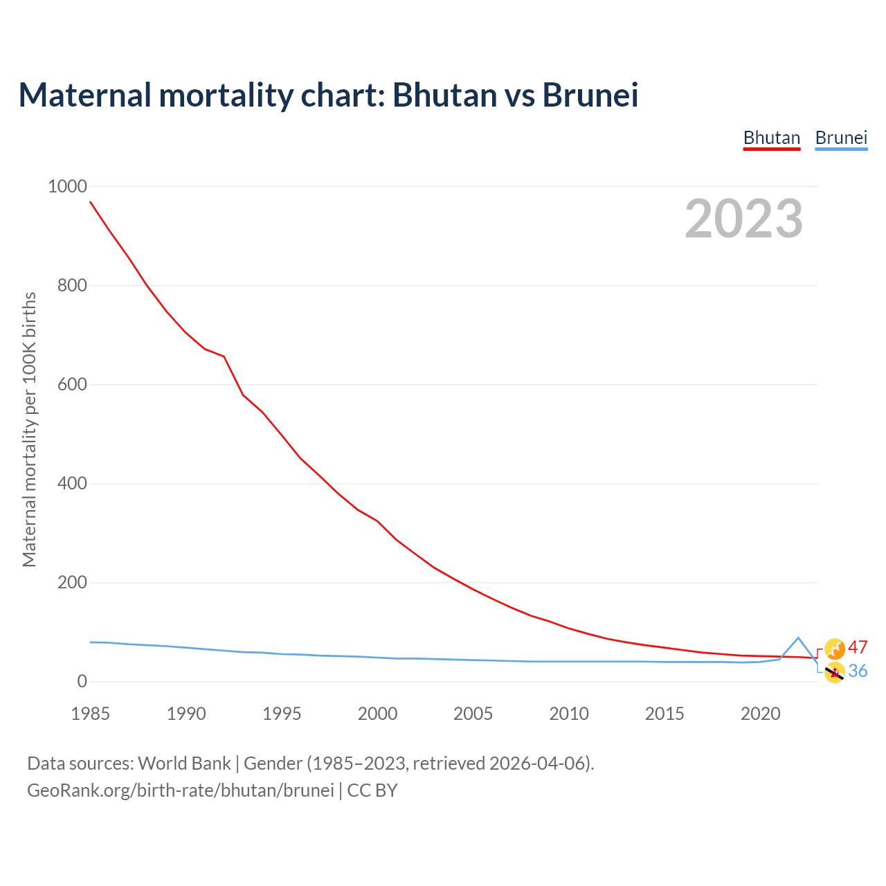 The maternal mortality rate, which is the probability of dying during childbirth or within 42 days of pregnancy termination, is 47 deaths per 100,000 live births in Bhutan, compared to 36 deaths in Brunei.