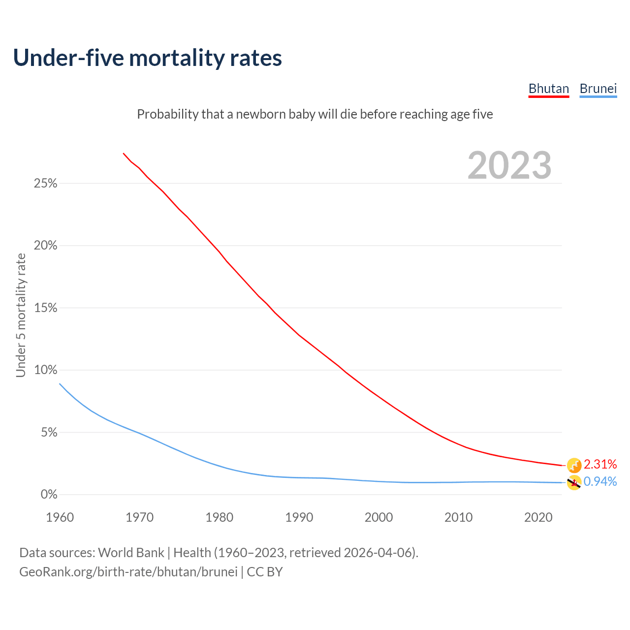 The chance that a newborn baby will die before reaching age five is 2.31% in Bhutan and 0.94% in Brunei. Above is a chart with historical data on under-five mortality rates.