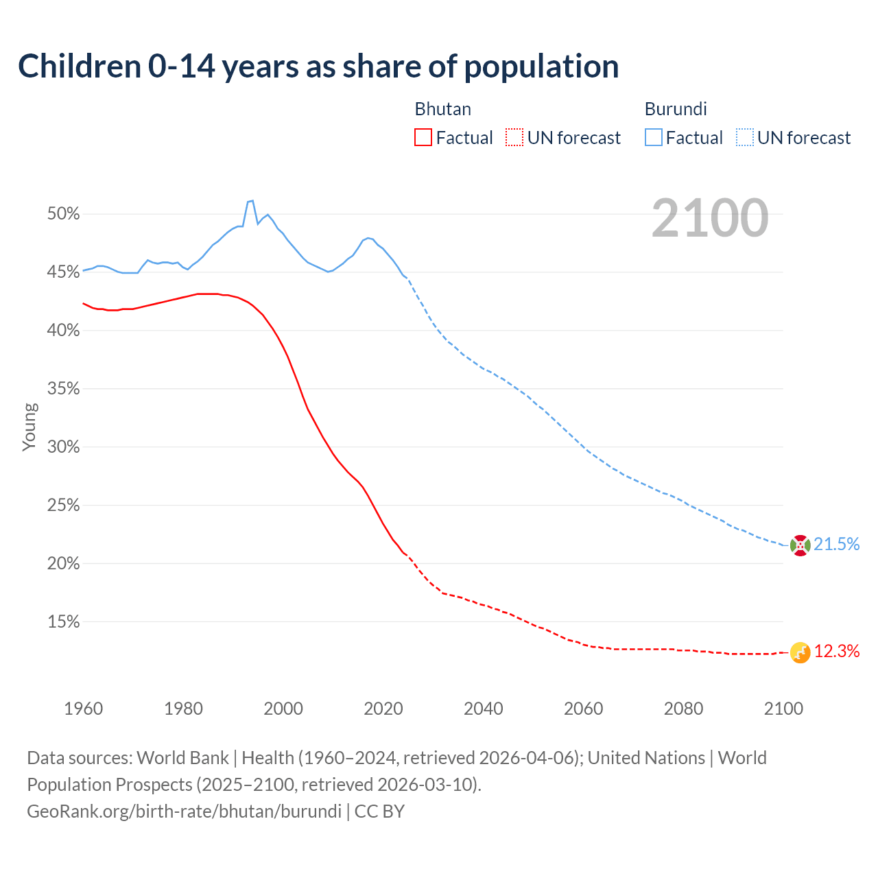 According to the latest available data on birth rates, the fertility rate in Bhutan was 1.46 children per woman in 2023, compared to 4.88 in Burundi in 2023. The replacement level is considered to be 2.1 children per woman.