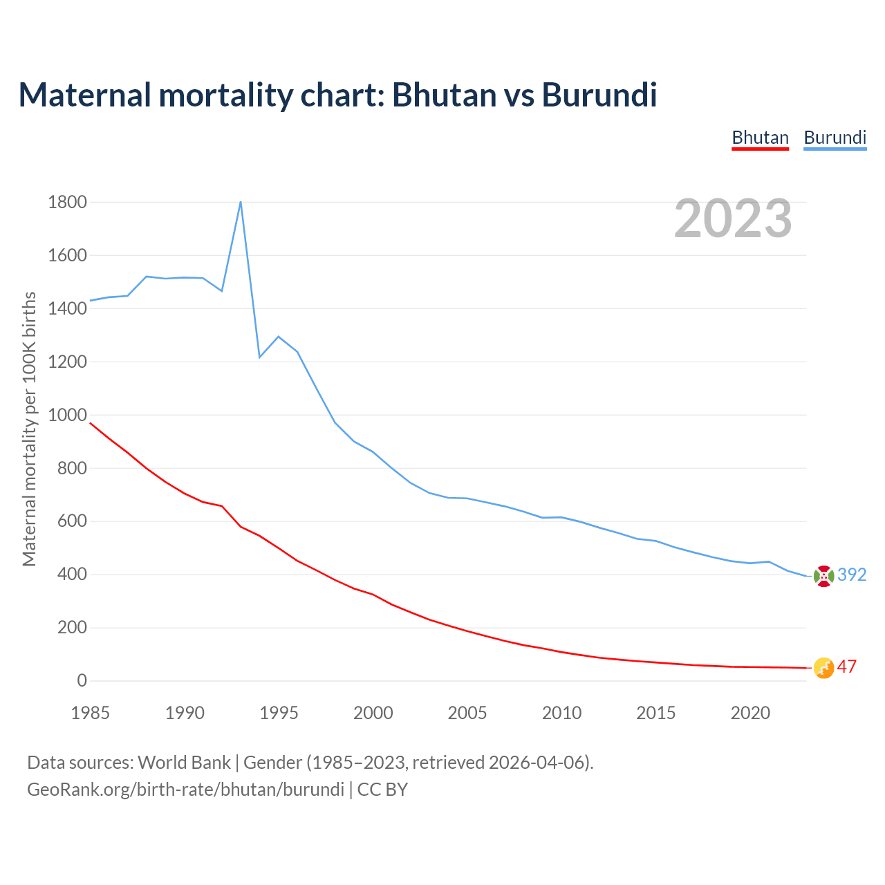 The maternal mortality rate, which is the probability of dying during childbirth or within 42 days of pregnancy termination, is 47 deaths per 100,000 live births in Bhutan, compared to 392 deaths in Burundi.