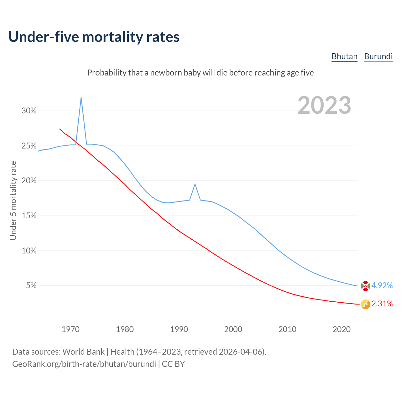 The chance that a newborn baby will die before reaching age five is 2.31% in Bhutan and 4.92% in Burundi. Above is a chart with historical data on under-five mortality rates.