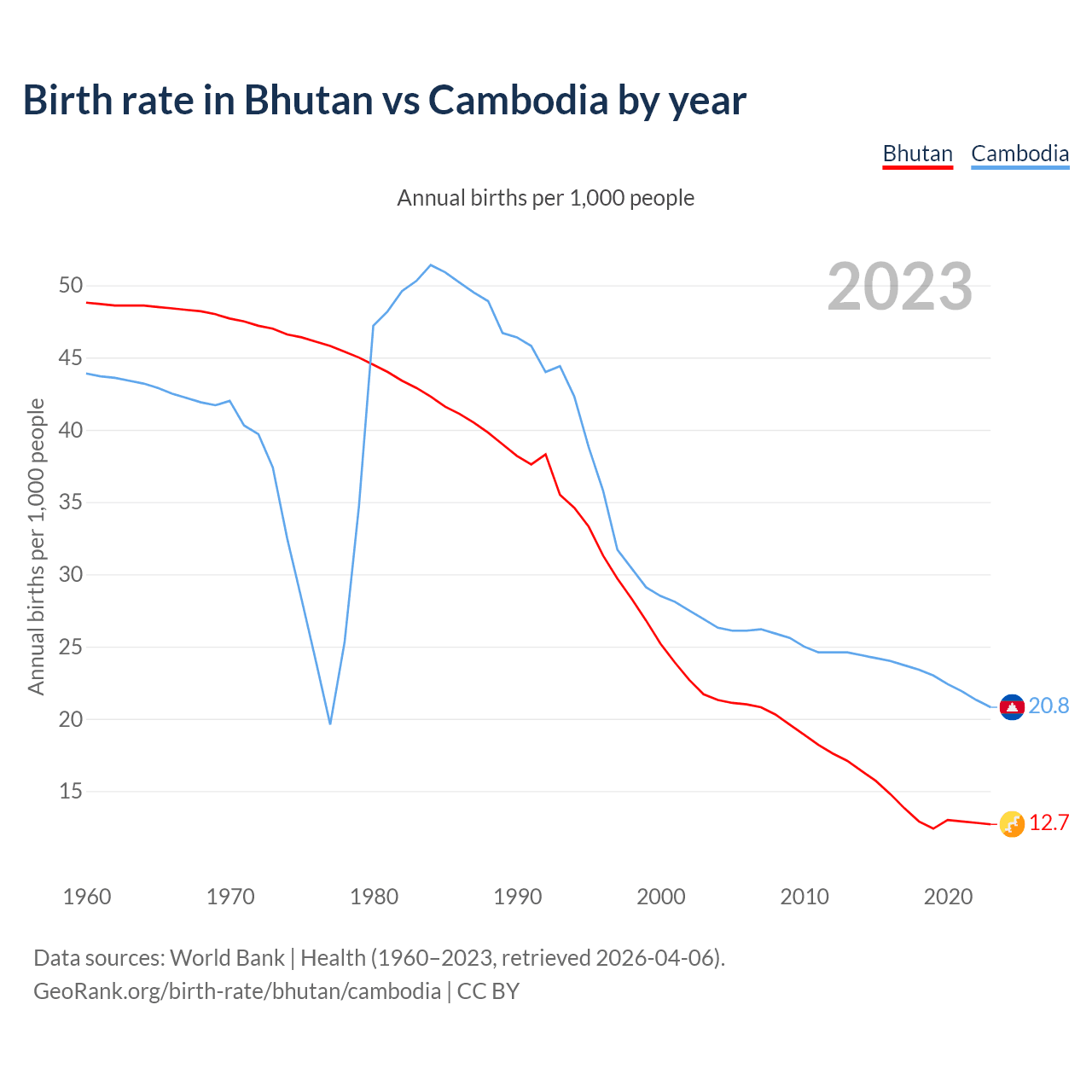 Bhutan has an annual birth rate of 12.7 births per 1,000 people, compared to 20.8 for Cambodia. The average number of children a woman is expected to have during her lifetime — the fertility rate, is 1.46 in Bhutan and 2.58 in Cambodia — 76.4% difference.