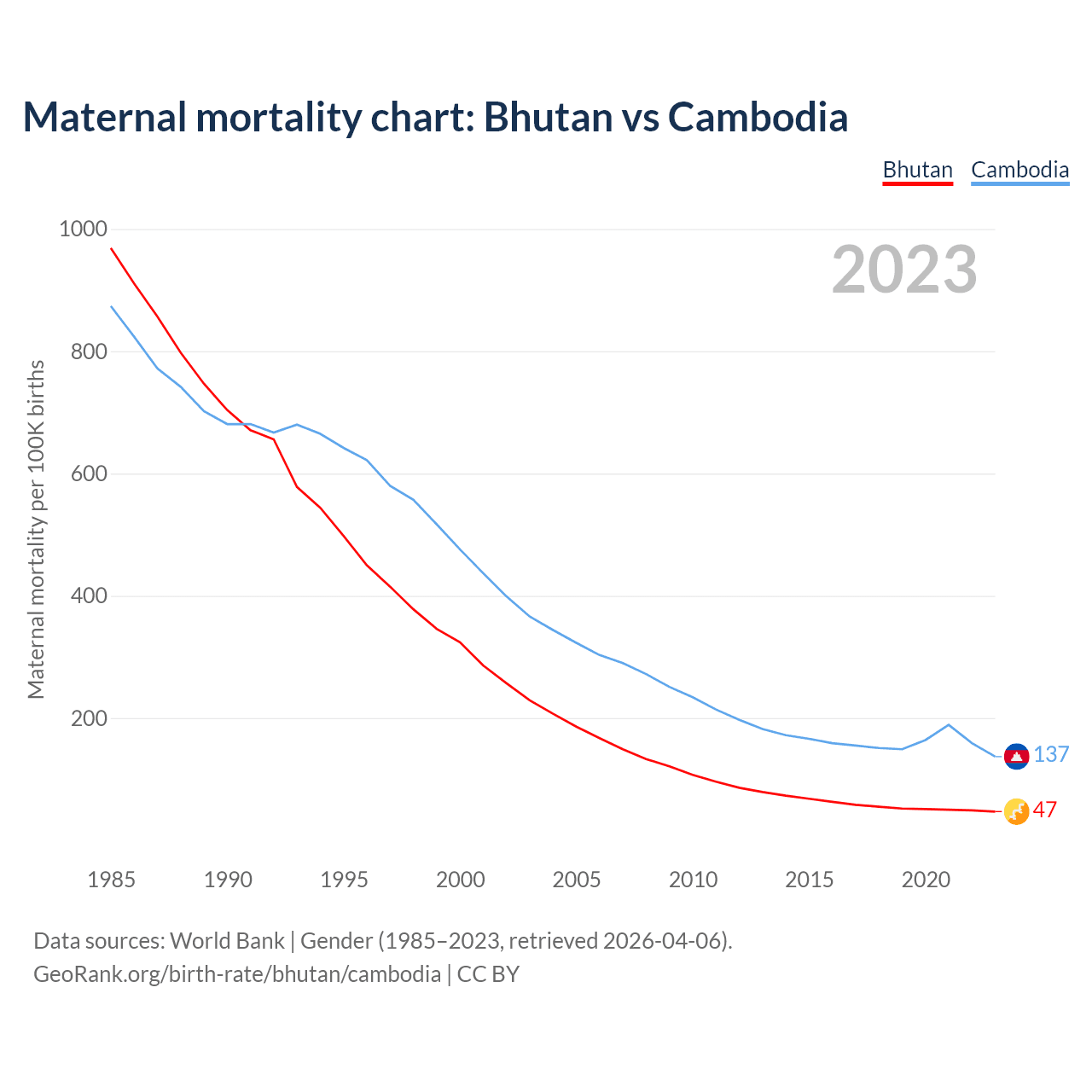 The maternal mortality rate, which is the probability of dying during childbirth or within 42 days of pregnancy termination, is 47 deaths per 100,000 live births in Bhutan, compared to 137 deaths in Cambodia.