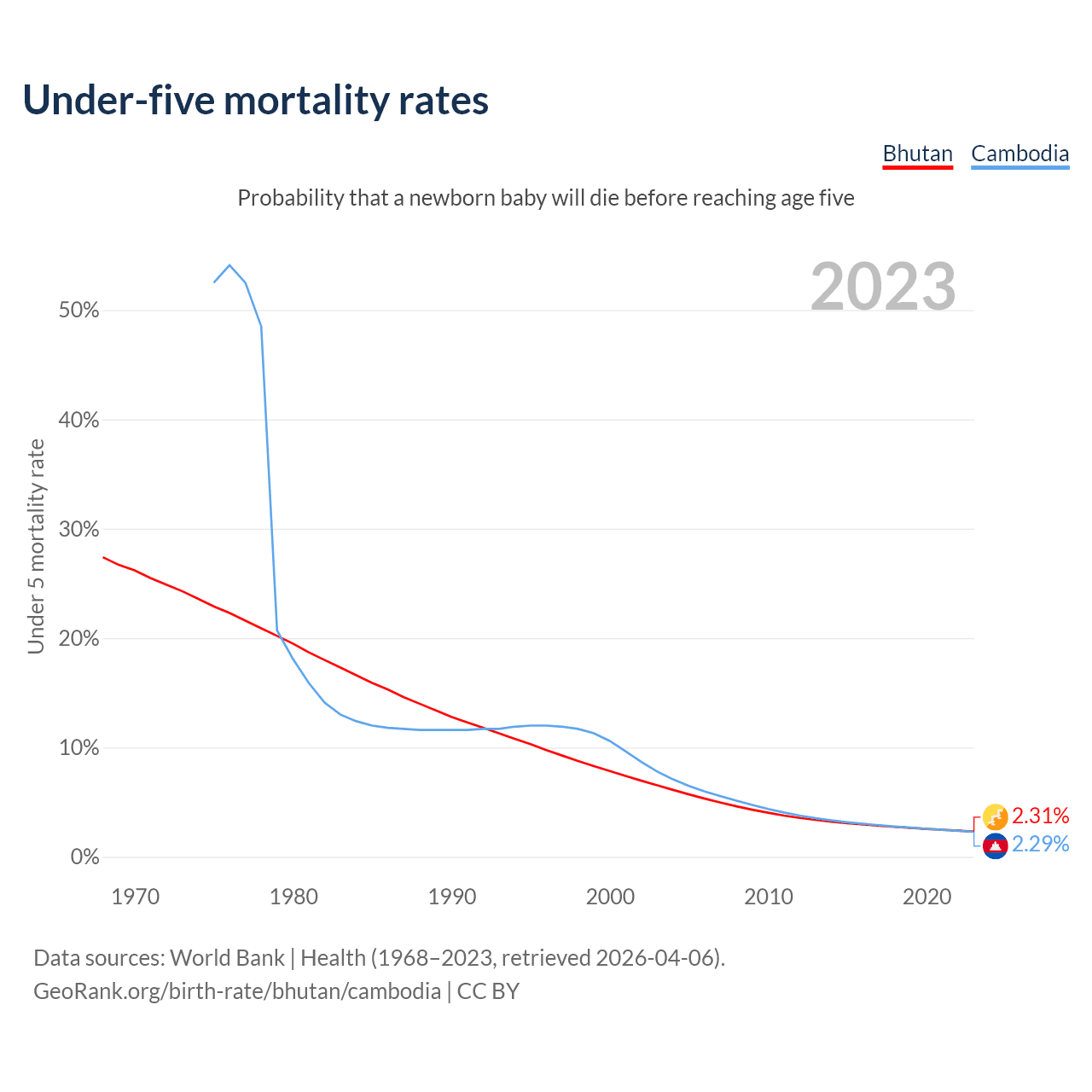 The chance that a newborn baby will die before reaching age five is 2.31% in Bhutan and 2.29% in Cambodia. Above is a chart with historical data on under-five mortality rates.